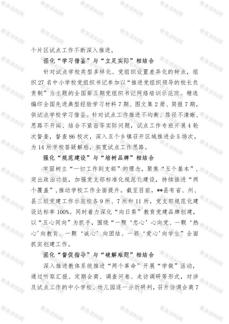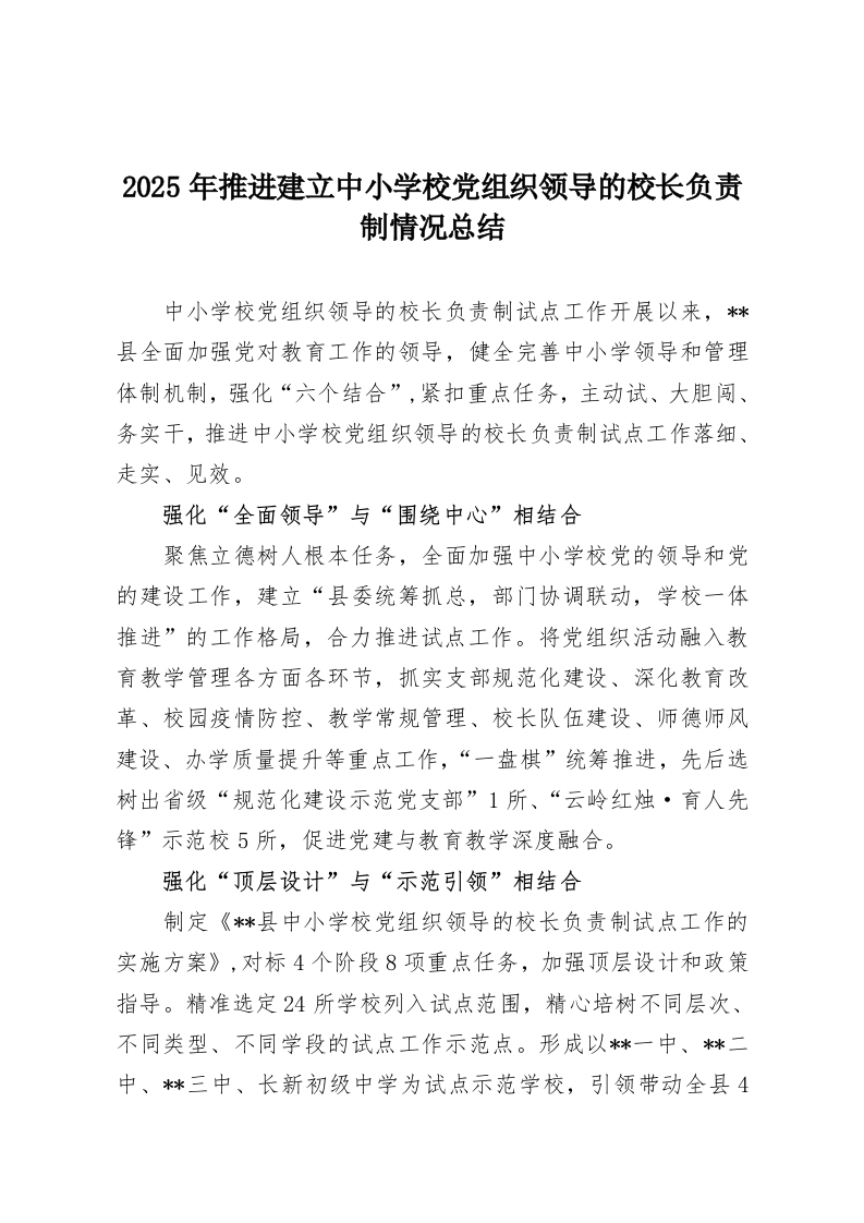 2025年推进建立中小学校党组织领导的校长负责制情况总结中小学校党组织领导的校长负责制试点工作开展以来,*县全面加强党对教育工作的领导,健全完善中小学领导和管理体制机制,强化“六个结合”,紧扣重点任务,主动试、大胆闯、务实干,推进中小学校党组织领导的校长负责制试点工作落细、走实、见效。强化“全面领导”与“围绕中心”相结合聚焦立德树人根本任务,全面加强中小学校党的领导和党的建设工作,建立“县委统筹抓总,部门协调联动,学校一体推进”的工作格局,合力推进试点工作。将党组织活动融入教育教学管理各方面各环节,抓实支部规范化建设、深化教育改革、校园疫情防控、教学常规管理、校长队伍建设、师德师风建设、办学质量提升等重点工作,“一盘棋”统筹推进,先后选树出省级“规范化建设示范党支部”1所、“云岭红烛·育人先锋”示范校5所,促进党建与教育教学深度融合。强化“顶层设计”与“示范引领”相结合制定《*县中小学校党组织领导的校长负责制试点工作的实施方案》,对标4个阶段8项重点任务,加强顶层设计和政策指导。精准选定24所学校列入试点范围,精心培树不同层次、不同类型、不同学段的试点工作示范点。形成以*一中、*二中、*三中、长新初级中学为试点示范学校,引领带动全县4