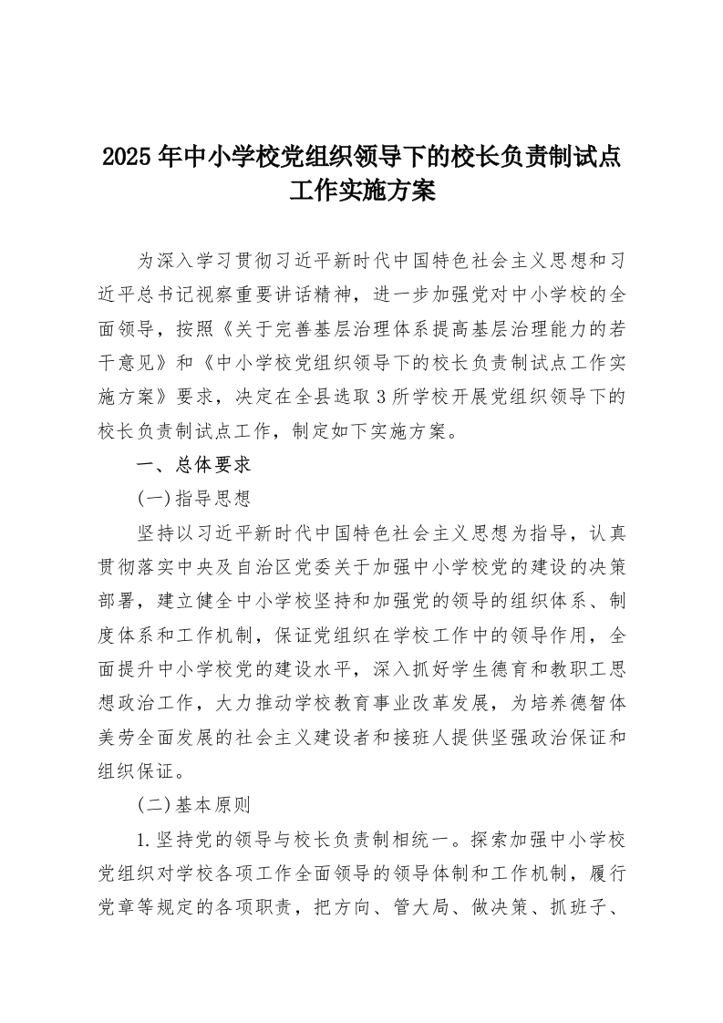 2025年中小学校党组织领导下的校长负责制试点工作实施方案为深入学习贯彻习近平新时代中国特色社会主义思想和习近平总书记视察重要讲话精神,进一步加强党对中小学校的全面领导,按照《关于完善基层治理体系提高基层治理能力的若干意见》和《中小学校党组织领导下的校长负责制试点工作实施方案》要求,决定在全县选取3所学校开展党组织领导下的校长负责制试点工作,制定如下实施方案。一、总体要求(一)指导思想坚持以习近平新时代中国特色社会主义思想为指导,认真贯彻落实中央及自治区党委关于加强中小学校党的建设的决策部署,建立健全中小学校坚持和加强党的领导的组织体系、制度体系和工作机制,保证党组织在学校工作中的领导作用,全面提升中小学校党的建设水平,深入抓好学生德育和教职工思想政治工作,大力推动学校教育事业改革发展,为培养德智体美劳全面发展的社会主义建设者和接班人提供坚强政治保证和组织保证。(二)基本原则1.坚持党的领导与校长负责制相统一。探索加强中小学校党组织对学校各项工作全面领导的领导体制和工作机制,履行党章等规定的各项职责,把方向、管大局、做决策、抓班子、