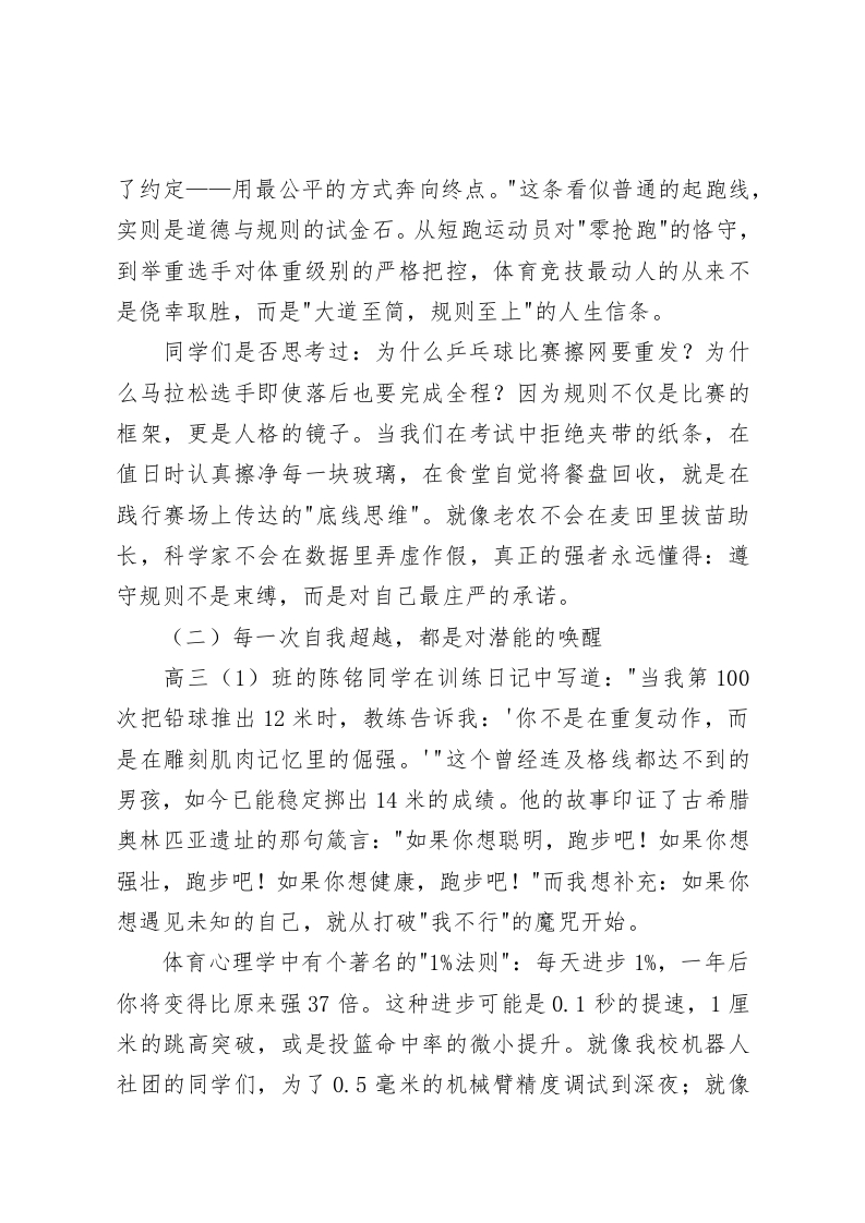 2025秋季运动会开幕式,校长讲话:赛场即人生:为何伤痕比奖牌更值得珍藏?尊敬的各位老师,亲爱的同学们:大家上午好!秋阳正好,丹桂吐蕊,我们怀着无比振奋的心情相聚在这片沸腾的运动场,共同拉开2025年秋季运动会的序幕。此刻,旌旗猎猎映照着青春的脸庞,鼓乐声声激荡着奋进的胸膛,跑道上的起跑线不仅丈量着距离,更标注着成长的刻度。首先,我谨代表学校向为盛会筹备倾注心血的全体教职工致以崇高敬意!向不畏酷暑坚持训练的运动员们送上诚挚问候!向莅临指导的各位嘉宾与家长朋友们表示热烈欢迎!体育从来不是孤注一掷的胜负游戏,而是生命最鲜活的教育现场。今天,我想和大家探讨一个看似矛盾的命题:当我们在赛场上追逐奖牌时,为何那些跌倒的瞬间、磨破的手掌、湿透的衣衫,反而比金牌更值得我们珍藏?让我们一同在这场运动盛会中,解码赛场与人生的深层共鸣,读懂伤痕背后的成长密码。一、赛场如明镜:照见规则与自律的人生底色(一)每一条起跑线,都是对底线的承诺去年校运会女子800米决赛的场景至今令人动容:当裁判鸣枪时,七年级(4)班的林小雨同学因跑鞋打滑险些摔倒,却坚持没有抢跑重发。赛后她说:"枪响的瞬间,我就和跑道许下