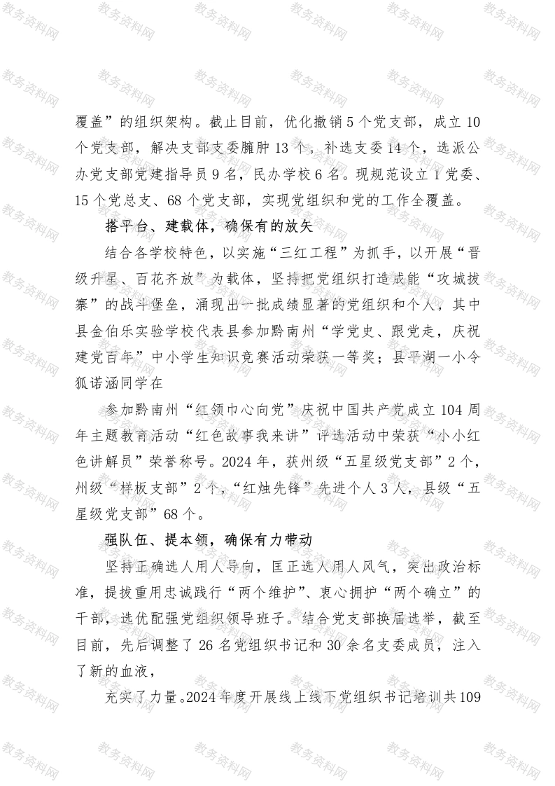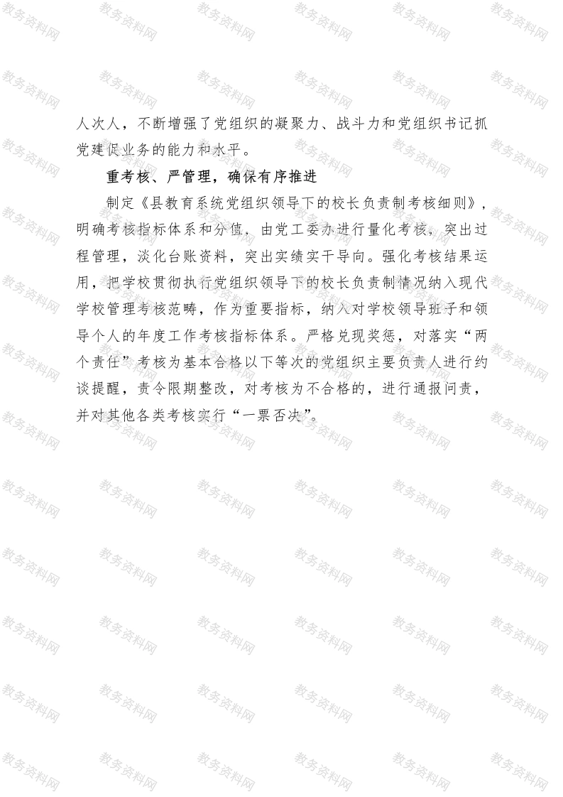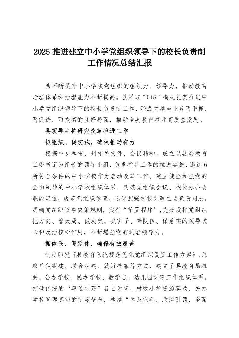 2025推进建立中小学党组织领导下的校长负责制工作情况总结汇报为不断提升中小学校党组织的组织力、领导力,推动教育治理体系和治理能力不断提高。县采取“5+5”模式扎实推进中小学党组织领导下的校长负责制工作,形成党建与业务两手抓、两促进、两提高的良好局面,推动全县教育事业高质量发展。县领导主持研究改革推进工作抓组织、促实施,确保推动有力根据中央和省、州相关文件、会议精神,成立以县委教育工委书记为组长的领导小组,负责指导工作的推进实施,遴选6所符合条件的中小学校作为启动改革工作。建立健全加强党的全面领导的中小学校组织体系,明确党组织会议、校长办公会职能定位,规范党组织设置,选优配强学校党政主要负责同志,明确党组织议事决策规则,实行“前置程序”,充分发挥党组织把方向、管大局、做决策、抓班子、带队伍、保落实的领导核心和政治核心作用,不断增强党的政治领导力。抓体系、促延伸,确保有效覆盖制定印发《县教育系统规范优化党组织设置工作方案》,采取单独组建、联合组建、就近挂靠等方式,建立了县教育局机关、公办学校、民办学校、教学点、幼儿园党建工作组织体系,打破传统的“单位党建”各自为阵、村级小学资源零散、民办学校管理真空的制度壁垒,构建“体系完善、政治引领、全面