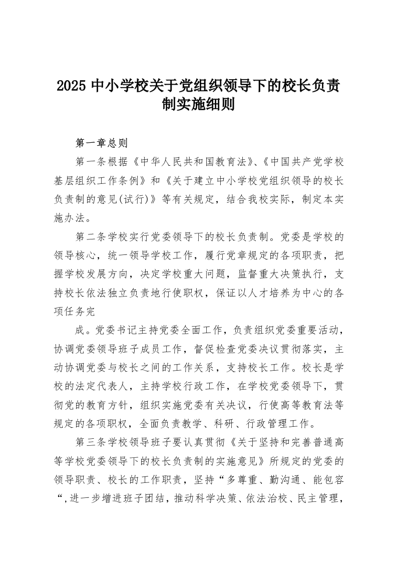2025中小学校关于党组织领导下的校长负责制实施细则第一章总则第一条根据《中华人民共和国教育法》、《中国共产党学校基层组织工作条例》和《关于建立中小学校党组织领导的校长负责制的意见(试行)》等有关规定,结合我校实际,制定本实施办法。第二条学校实行党委领导下的校长负责制。党委是学校的领导核心,统一领导学校工作,履行党章规定的各项职责,把握学校发展方向,决定学校重大问题,监督重大决策执行,支持校长依法独立负责地行使职权,保证以人才培养为中心的各项任务完成。党委书记主持党委全面工作,负责组织党委重要活动,协调党委领导班子成员工作,督促检查党委决议贯彻落实,主动协调党委与校长之间的工作关系,支持校长工作。校长是学校的法定代表人,主持学校行政工作,在学校党委领导下,贯彻党的教育方针,组织实施党委有关决议,行使高等教育法等规定的各项职权,全面负责教学、科研、行政管理工作。第三条学校领导班子要认真贯彻《关于坚持和完善普通高等学校党委领导下的校长负责制的实施意见》所规定的党委的领导职责、校长的工作职责,坚持“多尊重、勤沟通、能包容“,进一步增进班子团结,推动科学决策、依法治校、民主管理,