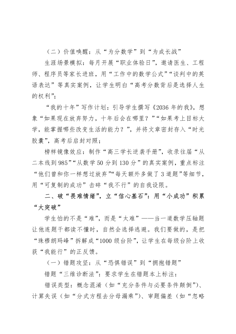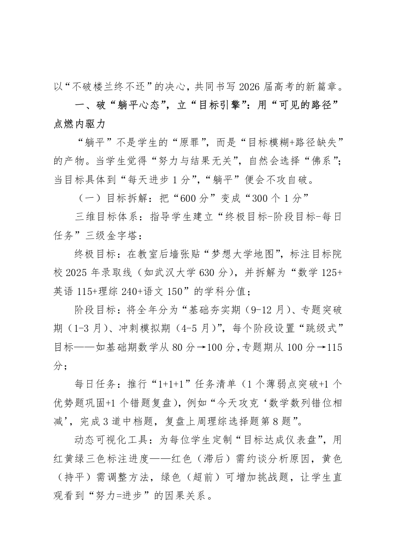 2026届高三班主任备考工作部署会,校长讲话:3破3立:从“躺平”到“冲刺”的高考攻坚密码各位班主任同仁:金秋九月,当高一新生在军训场上挥洒汗水,高二学子在知识图谱中搭建框架时,我们2026届高三团队已站在高考倒计时的“百米起跑线”。今天,我们以“3破3立”为主题召开备考部署会,既是对过去一年“摸着石头过河”的经验复盘,更是对未来300天“精准攻坚”的路径规划。首先,我代表学校,向连续奋战在一线的各位班主任致敬一一你们的每一次深夜备课、每一次家校沟通、每一次考场外的守候,都是学生心中“永不熄灭的灯塔”。当前,高三备考正面临“三重矛盾”:从命题趋势看,全国卷已从“知识立意”转向“素养导向”,但部分教师仍在沿用“题型套路化、训练机械化”的旧模式;从学生状态看,58%的学生在近期问卷中承认“有过放弃努力的念头”,“躺平”正从个别现象演变为“群体心态”;从管理实践看,我们既要“抓分数”确保升学率,又要“保心态”守护成长,如何在“刚性要求”与“柔性关怀”间找到平衡点?魏总支委在上周的调研中强调:“高三班主任是破解备考困局的‘第一把钥匙’。”今天,我将围绕“3破3立”一一破“躺平心态”立“目标引擎”、破“畏难情绪”立“信心基石”、破“协同壁垒”立“攻坚合力”,与大家展开深度交流,期待我们