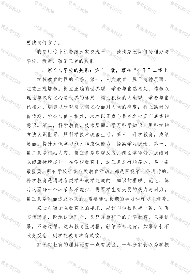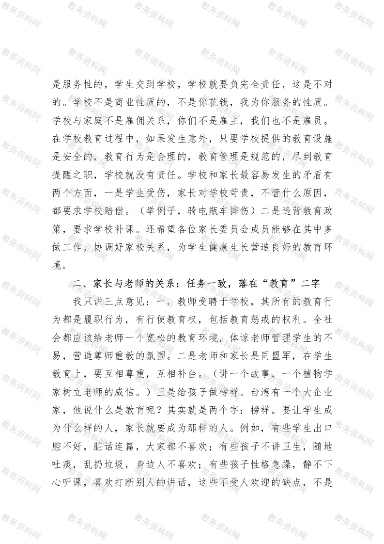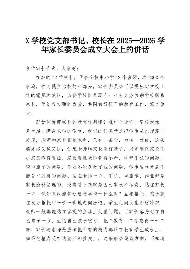 X学校党支部书记、校长在2025一2026学年家长委员会成立大会上的讲话各位家长代表,大家好:在座的42位家长,代表全校中小学42个班级,近2000个家庭,作为民主治校的一部分,家长委员会可以提出对学校工作的意见和建议,监督学校恪尽职守;也有义务协助学校联系家长,团结各方面的力量,共同做好孩子的教育工作,意义重大。那如何发挥家长的教育作用呢?我打个比方,学校就像一条大船,满载求学的学生,我们的任务就是把学生从此岸渡向彼岸,老师和家长都是水手,只有一条心,力往一处使,这条船才能又稳又快;如果老师和家长互相猜忌,老师责怪家长不尽家庭教育责任,家长责怪老师管得不严,如带手机的问题,骑电瓶车的问题,作业不能及时完成的问题,学生发生矛盾不能公平对待的问题。站在老师一方,手机、电瓶车、作业都是家长能够管理的,没有管下来就是因为家长不尽责;站在家长一方,说如果我能管还要送学校干什么呢?互相推托。孩子就在双方推托中一步一步地走向岔道。学生之间发生矛盾冲突,老师一般都能站在客观的立场上处理问题,可家长容易站在自己孩子一方,生怕自己孩子吃亏,把“教育”二字忘得一干二净。家长与老师是应该把所有的精力都用在教育学生成长上,如果把精力花在这些互相扯皮上,这条船会偏离方向,不知道