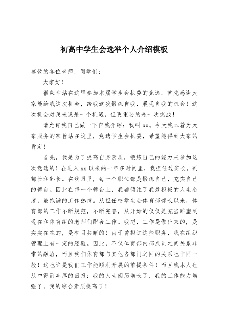 初高中学生会选举个人介绍模板尊敬的各位老师、同学们:大家好!很荣幸站在这里参加本届学生会执委的竞选。首先感谢大家能给我这次机会,给我这次锻炼自我,展现自我的机会!这次机会对我来说是一个机遇,但更重要的是一次挑战!请允许我自己做一下自我介绍:我叫xx。今天我本着为大家服务的宗旨站在这里,竞选学生会执委,希望能得到大家的肯定!首先,我是为了提高自身素质,锻炼自己的能力来参加这次竞选的!在进入Xx以来的一年多时间里,我担任过班长,副部长和部长。在我眼里,每一个职位都是锻炼自己,充实自己的舞台。因此在每一个舞台上,我都倾注了我最积极的人生态度,最饱满的工作热情。从担任校学生会体育部部长以来,体育部的工作不断规范,不断完善,从开始的仅仅是充当雕塑到现在和体育组的老师们配合工作。我想,工作是做出来的,是实实在在的,是有目共睹的!由于曾担过这些职务,我在组织管理上有一定的经验。因此,不仅体育部内部成员之间关系非常的融洽,而且我们体育部与其他各部门之间的关系也非同一般!这也许是我们工作能顺利开展的前提条件!而且我本人也从中得到丰厚的回报:我的人生阅历增长了,我的工作能力增强了,我的综合素质提高了!