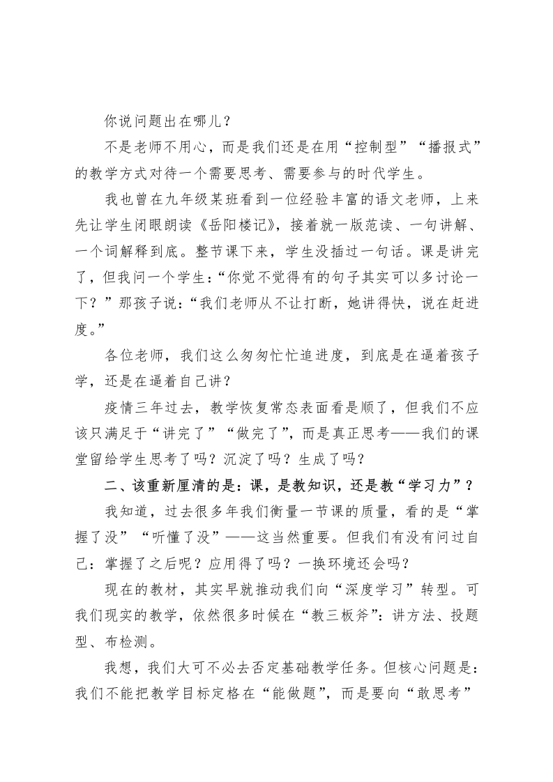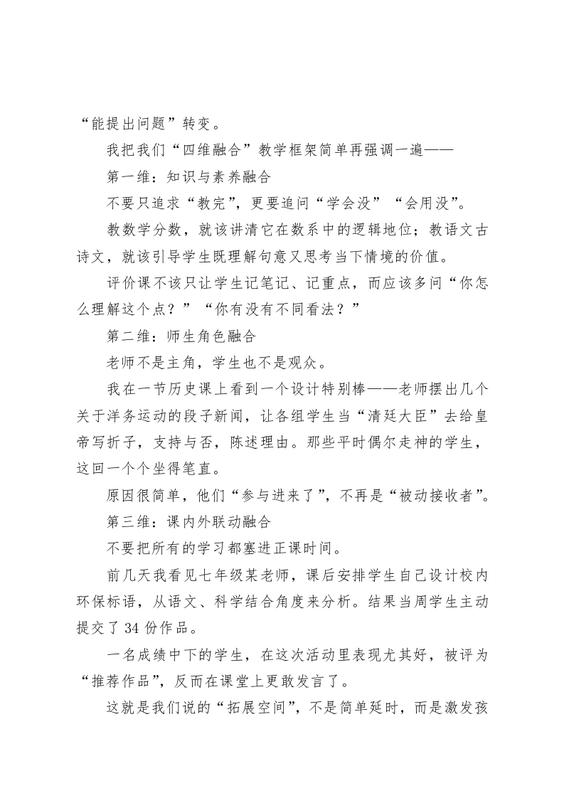 分管教学副校长在全体教师会上讲话:一节好课,能点燃一个学生的世界!各位老师:大家下午好!秋分已过,早晚微凉。我们这个学期已经过去了小一个月,各位也基本进入到了自己的教学节奏当中。今天这个会一一没有评分、没有展示、也没有表彰。为什么要开这场会?我昨晚仔细想了想,其实就是一个目的,也可以说是一句疑问:在“双减”和新课标背景下,我们的“课”,到底要怎么上?说实话,这个问题我们不是第一次讨论。但我越是听课越是发现一个尴尬的现实存在:越来越多的课堂虽然“热闹”了,但真学会了的学生,似乎也没多多少。我们说课要提质、要增效,可到底怎么提、往哪儿提,不少老师其实是心里没底的。今天我想讲的不是讲座式的理念,也不想重复什么文件。我就是想和各位掏心窝地说一说:如果我们还沿用老一套方式去教现在的学生,怕是连自己都不会相信这样的课堂有未来。一、课表排得再满,也挡不住学生关注度“空转”上周我去初二年级听课,是一节讲《水的三态变化》的科学课。老师备课很充分,PPT做得也精致,可我坐在教室后排看着20多个学生一一只有前排几个在跟着动脑,后排的甚至有两位在摆小玩具。到小组实验环节,一个学生悄悄跟我说:“这个试验我们上学期在兴趣社团已经做过了。”
