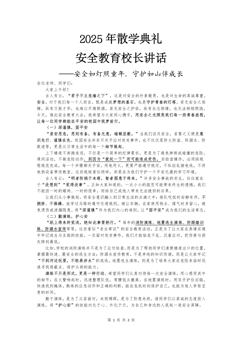 2025年散学典礼安全教育校长讲话安全如灯照童年,守护如山伴成长各位老师、同学们:大家上午好!古人有云,“君子不立危墙之下”,这是对安全的朴素嫩畏,也是对生命的真诚尊重。安全,对于我们每一个人而言,既是成就梦想的基石,也是守护青春的灯塔。若无安全之保障,纵有万般才华,也难以尽情挥洒。若无安全之护佑,纵有壮志热情,也无法持续燃烧。今天,借此安全教有大会,我希望与大家同心携手,用安全之光照亮我们每一段青春旅程,让每一位同学都能在平安的校园中筑梦前行。(一)深谨慎,固平安“居安思危,思则有备,有备无患,端赖坚毅。”当我们谈及安全,首要之义便是意识先行、谨慎在先。校园安全并非只关乎应对突发事件,也不仅仅是防火防盗、防溺水、防欺凌等,更是从日常生活中的每一个细节做起。上下楼道不奔跑追逐,不仅是一个简单的纪律要求,更是为了避免摔倒或碰撞的危险。课间活动,不做危险动作,别因为“就玩一下”而可能造成受伤。实验室操作,必须按规程规范完成,每一个步骤都关乎安,用电用火,更要严格遵守规定,不私拉乱接电线,不将电热设备带进教室。这些规矩看似琐碎,却是在为我们守护一个平安无虞的学习环境。古人有云:“明者防祸于未萌,智者图患于将来。”许多安全事故的发生,往往就在于“没想到”“觉得没事”。正如大家知道的,一次小小的疏忽可能带来终生的遗憾。我们不能因一时的嬉闹、一时的侥幸,而给自己或他人带来无法挽回的后果。让我们从小事做起,将安全意识融入到日常生活的点滴之中:排队吃饭时安静有序,不拥挤、不推搡,放学过马路时遵守交通规则,避让车辆,在家使用热水、煤气时多留心,避免烫伤或泄漏隐患。将“深谨慎”作为我们内心的准则,让“固平安”成为我们的生活常态。(二)勒演练,护心安“纸上得来终觉浅,绝知此事要躬行。”每年的消防演练、地震逃生演练、防踩踏训练、防溺水宣传等等,这些看似“老生常谈”的安全教有活动,正是为了让大家在真情实境中牢记逃生与互救的技能。一旦面对突发事件,我们才能临危不乱、沉着应对,把伤害与损失降到最低。比如,学校的消防演练并不是为了应付检查,而是为了帮助同学们清楚楼道出口的位置,掌握最快速、最安全的逃生方法:防溺水宣传教有,不是单纯的知识传递,而是让大家牢记“不到河边玩要,不轻易涉水”的底线。地震逃生演练,则是为了培养大家在危险来临时迅速寻找遮蔽点、保护头部的能力。演练不只是形式,更是一种行动。希望同学们认真对待每一次安全演练,用心感受其中的细节:在火警响起时,迅速整理队伍,弯腰低头撤离。在地震演练时,用双手护住后脑,快速找到掩体。熟练的应急动作和正确的判断,能在危机时刻保护自己,也能为他人争取宝贵的时间。勃于演练,是为了从容面对,未雨绸缪,是为了防患未然。请同学们以真诚的态度投入演练,将“护心安”的技能内化于心、外化于行,为自己和身边的人筑起一道安全屏障。第1页共2页