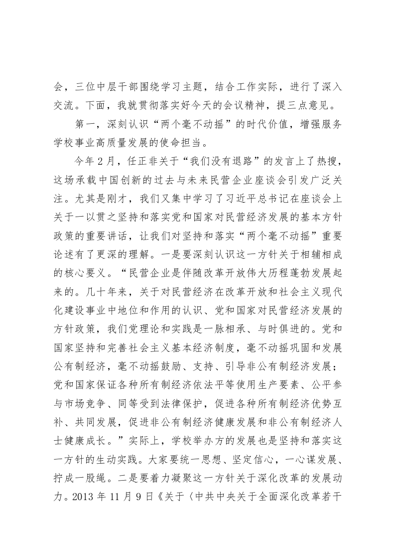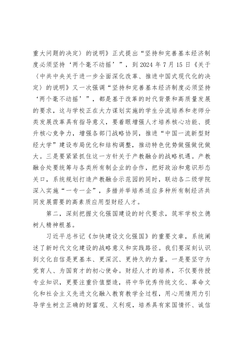 高校党委书记在2025年9月党委理论学习中心组(扩大)学习会上的讲话同志们:今天,我们召开新学期第1次中心组学习会,既是落实理论学习年度安排的规定动作,也是进一步凝聚学校合格评估中心工作组织合力的现实要求,更是汇聚“个个有赛道人人能出彩”分流培养与分类发展改革动力的战略需求。首先,传达学习近期两份文件。一是9月12日,…通报了2025年上半年全市高校…中心组学习情况,其中集体学习研讨次数最多的是…。我们…。同时,也指出了存在的个性问题,比如:有的单位开展学习研讨不及时,组织学习还不规范;部分单位学习主题不聚焦,集中学习研讨次数较少、不够深入,未组织开展专题调研,并部署了下一步工作任务。这里需要强调的是,…通报工作是一种落实检查机制。二是9月18日,…《中央宣传部、中央组织部关于认真组织学习《习近平谈治国理政》第五卷的通知》,…学习主题要聚焦、学习形式要规范、学习管理要逗硬。在此,一并进行10月份中心组学习内容部署,请党委宣传部提前谋划、认真组织。刚才,三位校领导依次领学了习近平总书记2013年11月至2025年2月期间有关坚持和落实“两个毫不动摇”重要论述的节录综述、两篇发表在《求是》杂志上的重要文章《加快建设文化强国》和《深入推进党的自我革命》,并分享了心得体