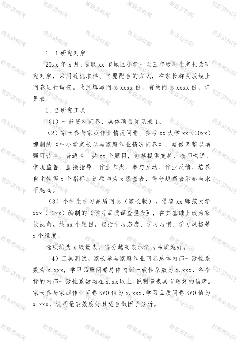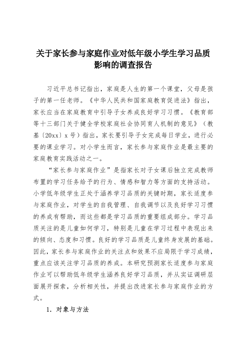 关于家长参与家庭作业对低年级小学生学习品质影响的调查报告习近平总书记指出,家庭是人生的第一个课堂,父母是孩子的第一任老师。《中华人民共和国家庭教育促进法》指出,家长应当在家庭教育中引导子女养成良好学习习惯。《教育部等十三部门关于健全学校家庭社会协同育人机制的意见》(教基〔20xx)x号)指出,家长要引导子女完成每日学业,进行必要的课业学习。对小学生而言,家长参与家庭作业是最主要的家庭教育实践活动之一。“家长参与家庭作业”是指家长对子女课后独立完成教师布置的学习任务给予的行为、情感和智力等方面的支持活动。小学低年级学生正处于涵养学习品质的关键时期,家长适度参与家庭作业,对学生的自我管理、自我调节以及良好学习习惯的养成有帮助,而这些都是学习品质的重要组成部分。学习品质关注的是儿童如何学习,特别是儿童在学习过程中表现出来的倾向、态度和习惯。良好的学习品质是儿童终身发展的基础。因此,家长参与家庭作业的关注点和效果不应局限于学习成绩,重点应该关注学习品质的养成。本研究预测家长适度参与家庭作业可以帮助低年级学生涵养良好学习品质,并从实证调研层面展开探索,分析相关性,并提出改进家长参与家庭作业的方式。1.对象与方法