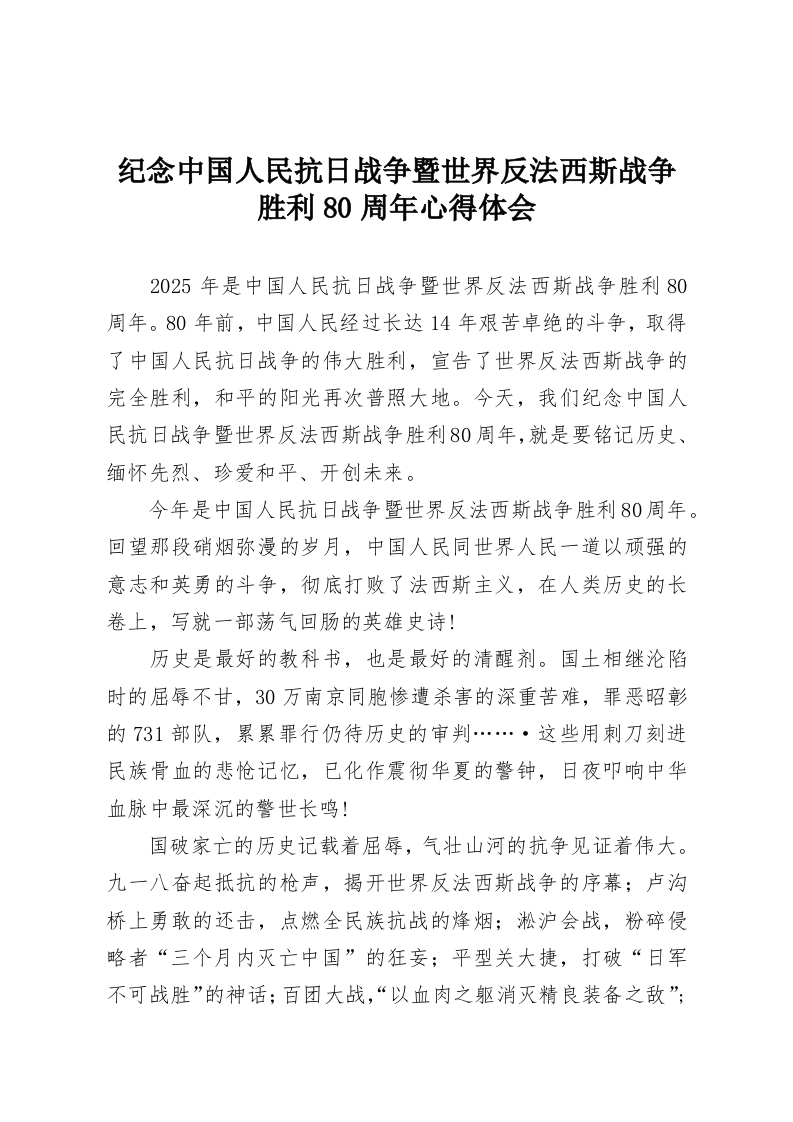 纪念中国人民抗日战争暨世界反法西斯战争胜利80周年心得体会2025年是中国人民抗日战争暨世界反法西斯战争胜利80周年。80年前,中国人民经过长达14年艰苦卓绝的斗争,取得了中国人民抗日战争的伟大胜利,宣告了世界反法西斯战争的完全胜利,和平的阳光再次普照大地。今天,我们纪念中国人民抗日战争暨世界反法西斯战争胜利80周年,就是要铭记历史、缅怀先烈、珍爱和平、开创未来。今年是中国人民抗日战争暨世界反法西斯战争胜利80周年。回望那段硝烟弥漫的岁月,中国人民同世界人民一道以顽强的意志和英勇的斗争,彻底打败了法西斯主义,在人类历史的长卷上,写就一部荡气回肠的英雄史诗!历史是最好的教科书,也是最好的清醒剂。国土相继沦陷时的屈辱不甘,30万南京同胞惨遭杀害的深重苦难,罪恶昭彰的731部队,累累罪行仍待历史的审判…·这些用刺刀刻进民族骨血的悲怆记忆,已化作震彻华夏的警钟,日夜叩响中华血脉中最深沉的警世长鸣!国破家亡的历史记载着屈辱,气壮山河的抗争见证着伟大。九一八奋起抵抗的枪声,揭开世界反法西斯战争的序幕;卢沟桥上勇敢的还击,点燃全民族抗战的烽烟;淞沪会战,粉碎侵略者“三个月内灭亡中国”的狂妄;平型关大捷,打破“日军不可战胜”的神话;百团大战,“以血肉之躯消灭精良装备之敌”;