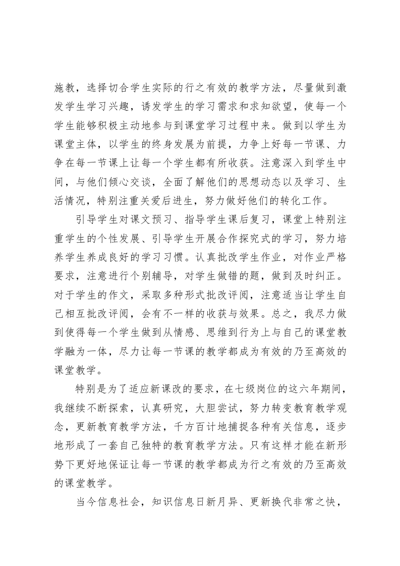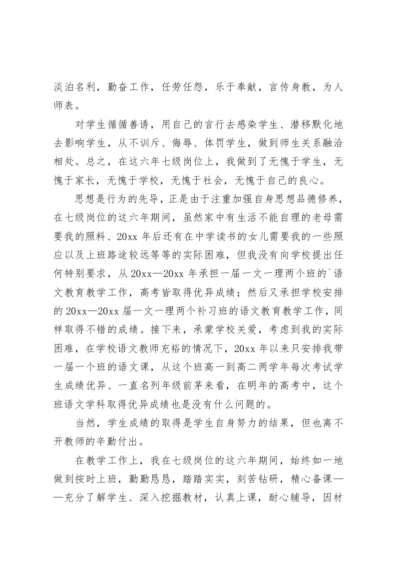 教师岗位竞聘报告3我是语文组的刘老师,20xx年评为、20xx年聘为本校中学高级教师七级岗位,现参加竞聘六级岗位,以下就本人在七级岗位六年教育教学工作做一汇报,简要述职如下,敬请学校领导审查评议:“学高为师,身正为范”(陶行知)“学为人师,行为世范”(启功),作为从教二十三年的中年女教师,我越来越深切的认识到,我们教师要坚持教书育人的宗旨,自觉履行教书育人的职责,而教师要教育好学生,自己首先要在学会做人上下足功夫、在如何做好人上过得硬才行。因此在这六年七级岗位上,本人一如既往地加强自身思想品德修养,遵纪守法,严格遵守《中小学教师职业道德规范》,恪守教师职业道德。用理想道德规范约束自己的行为,努力培养高尚的人格和道德情操。在这六年七级岗位上,本人始终坚持热爱人民的教育事业、热爱教师这个职业。始终以高度的责任心、积极的进取心投入到教育教学工作中去。并通过多种形式来学习和全面贯彻国家教育方针,特别是认真贯彻执行新形势下关于素质教育的方针政策,积极参加学校、教育局组织的各种活动(比如各种学习活动及运动会、乒乓球赛等),关心、了解国内外的时事政治,做到与时俱进、开拓创新:在这六年七级岗位上,本人始终做到爱岗敬业,遵守学校的各项规章制度,无条件服从学校的工作安排,积极做好本职工作,尊敬领导,团结同事,关爱学生,