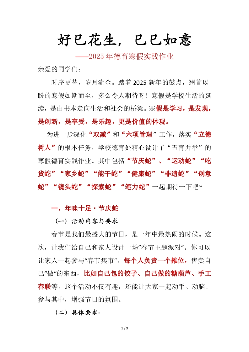 好巳花生,已已如意一2025年德育寒假实践作业亲爱的同学们:时序更替,岁月流金。踏着2025新年的鼓点,翘首以盼的寒假如期而至,多么令人期待呀!寒假是学校生活的延续,是由书本走向生活和社会的桥梁。寒假是学习,是发现,是创新,是享受,是乐趣,更是价值的体现。为进一步深化“双减”和“六项管理”工作,落实“立德树人”的根本任务,学校德育处精心设计了“五育并举”的寒假德育实践作业。其中包括“节庆蛇”、“运动蛇”“吃货蛇”“家乡蛇”“能干蛇”“健康蛇”“非遗蛇”“创意蛇”“镜头蛇”“探索蛇”“笔力蛇”一起期待一下吧~一、年味十足·节庆蛇(一)活动内容与要求春节是我们最盛大的节日,是一年中最热闹的时候。这次,让我们给自己和家人设计一场“春节主题派对”。你可以让家人一起参与“春节集市”,每个人负责一个摊位,售卖自己“做"”的东西,比如自己包的饺子、自己做的糖葫芦、手工春联等。这个活动不仅有趣,还能让大家一起动手、动脑、参与其中,增强节日的氛围。(二)具体要求:1/9