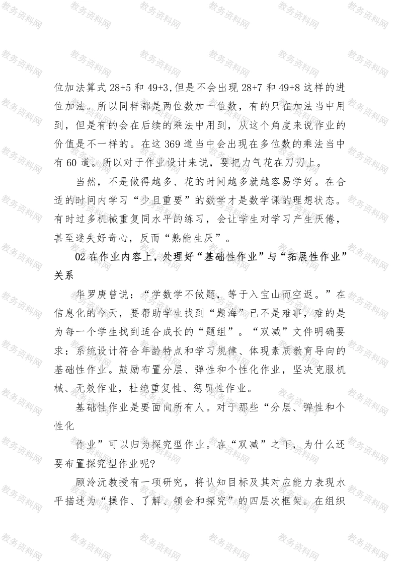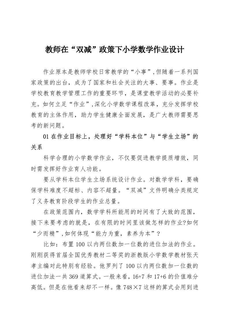 教师在“双减”政策下小学数学作业设计作业原本是教师学校日常教学的“小事”,但随着一系列国家政策的出台,成为了国家和社会关注的大事、要事。作业是学校教育教学管理工作的重要环节,是课堂教学活动的必要补充。如何立足“作业”,深化小学数学课程改革,充分发挥学校教育的主体作用,助力学生健康全面发展,是广大教师需要思考的新问题。01在作业目标上,处理好“学科本位”与“学生立场”的关系科学合理的小学数学作业,不仅要促进教学提质增效,同时需发挥好作业育人功能。要从学科本位学生立场系统设计作业。对数学学科,要确保学科难度不超标、内容不超量。“双减”文件明确分类规定了义务教育阶段学生的作业总量。在政策范围内,数学学科所能用的时间有了大致的范围,接下来要考虑的就是,在有限的时间里该做怎样的作业?如何“少而精”,如何体现“能力为重,素养为本”?比如:布置100以内两位数加一位数的进位加法的作业。刚刚获得首届全国优秀教材二等奖的浙教版小学数学教材张天孝主编对此特别有经验。他罗列了100以内两位数加一位数的进位加法一共369道算式。一般来看,16+7和17+6的价值难分高低。但是在他看来却不一样。像748×7这样的算式会用到进