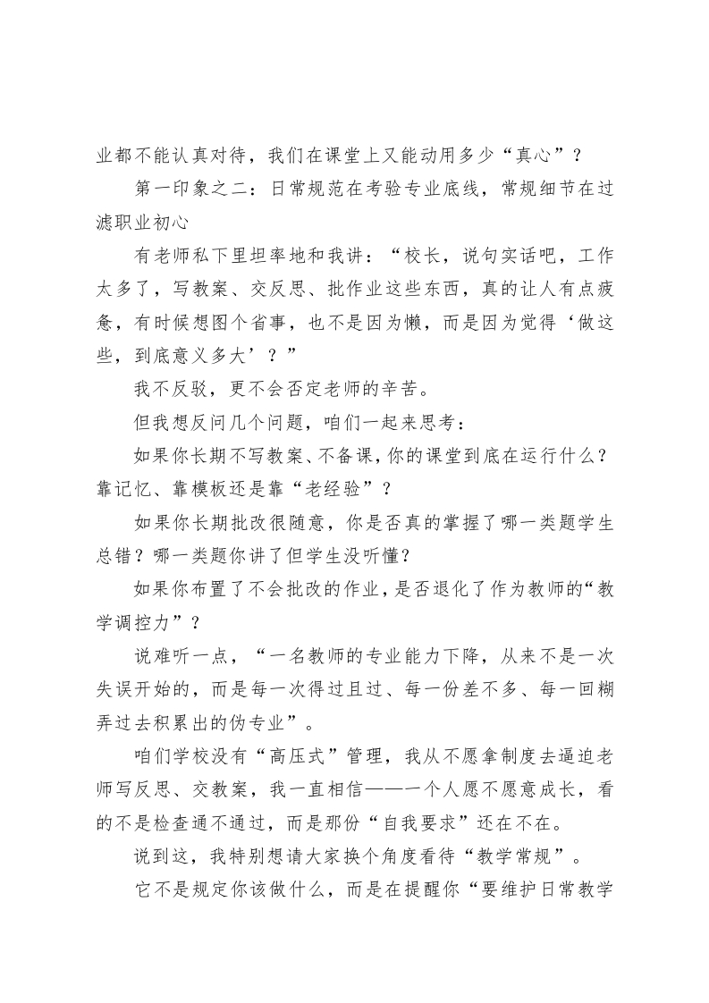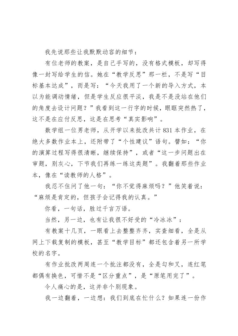 教学常规检查后教师大会上,校长讲话:有些教案看哭了我,有些作业看碎了心一一常规检查后,不得不说几句实话!各位老师:大家下午好!今天这个会,其实学校安排得很临时。教务处刚刚完成了新学期第一次教学常规检查,本来我打算按老规矩发一份简报,传达一下检查数据、进行一下公示,大家看一眼也就过去了。但后来我静下心来想:我们每学期检查好几轮,看了那么多本子、听了那么多课,收了那么多记录,可如果我们不能在某一个时间点认真面对一下这些最基础、最琐碎、最不起眼的教学日常一一那我们还怎么一起坚守“教育”两个字呢?所以,我临时决定不开简单通报会,我跟教务处说:数据先放一边,我要跟大家好好说一次心里话。今天我不想讲什么“优秀率”“达标率”“流程规范”,我要说的,是我们这一支教师队伍这一阶段暴露出来的三个“第一印象”,当然,也包括让我感动流泪的诸多微小细节,以及让我略带失望的一些“令人唏嘘”的现象。第一印象之一:有些教师,把教学当成了工序,却仍有人,把育人当成了信仰坦率讲,这次常规检查,有些内容真是触动了我。也让我意识到一个事实:教师的两极分化,正在悄悄出现。