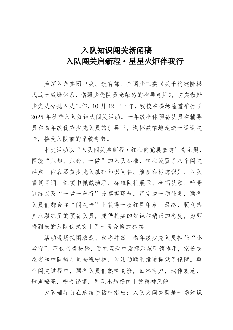 入队知识闯关新闻稿一一入队闯关启新程·星星火炬伴我行为深入落实团中央、教育部、全国少工委《关于构建阶梯式成长激励体系,增强少先队员光荣感的指导意见》,切实做好少先队分批入队工作,10月12日下午,我校在操场隆重举行了2025年秋季入队知识大闯关活动。一年级全体预备队员在辅导员和高年级优秀少先队员的引导下,满怀激情地走进一道道关卡,接受入队前的系统考验。本次活动以“入队闯关启新程·红心向党展童志”为主题,围绕“六知、六会、一做”的入队标准,精心设置了八个闯关站点。内容涵盖少先队基础知识问答、旗帜和标志识别、入队誓词背诵、红领巾佩戴演示、标准队礼展示、合唱队歌、呼号训练以及“一做一善行”分享等环节。每完成一项任务,预备队员们都会在“闯关卡”上获得一枚红星印章。最终,顺利集齐八颗红星的预备队员,凭借扎实的知识和端正的态度,为即将到来的入队仪式交上了一份合格的答卷。活动现场氛围浓烈、秩序井然。高年级少先队员担任“小考官”,不仅负责检验,更在互动中发挥示范引领作用;家长志愿者和中队辅导员全程守护,为活动顺利推进提供了保障。整个闯关过程中,预备队员们热情高涨,回答有力,动作规范,歌声嘹亮,呼号铿锵,展现出昂扬向上的精神风貌。大队辅导员在总结讲话中指出:入队大闯关既是一场知识