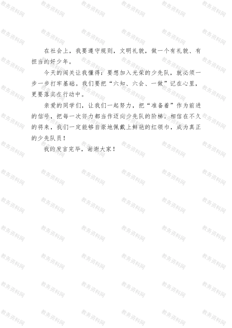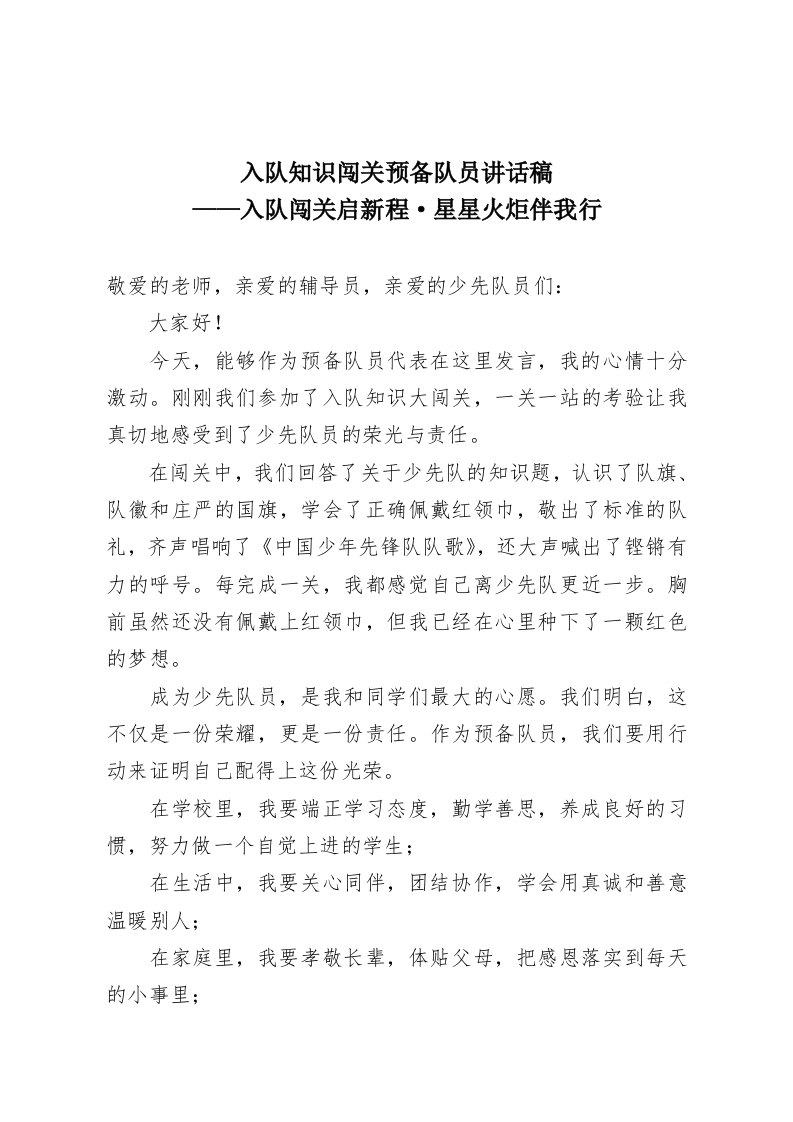 入队知识闯关预备队员讲话稿一入队闯关启新程·星星火炬伴我行敬爱的老师,亲爱的辅导员,亲爱的少先队员们:大家好!今天,能够作为预备队员代表在这里发言,我的心情十分激动。刚刚我们参加了入队知识大闯关,一关一站的考验让我真切地感受到了少先队员的荣光与责任。在闯关中,我们回答了关于少先队的知识题,认识了队旗、队徽和庄严的国旗,学会了正确佩戴红领巾,敬出了标准的队礼,齐声唱响了《中国少年先锋队队歌》,还大声喊出了铿锵有力的呼号。每完成一关,我都感觉自己离少先队更近一步。胸前虽然还没有佩戴上红领巾,但我已经在心里种下了一颗红色的梦想。成为少先队员,是我和同学们最大的心愿。我们明白,这不仅是一份荣耀,更是一份责任。作为预备队员,我们要用行动来证明自己配得上这份光荣。在学校里,我要端正学习态度,勤学善思,养成良好的习惯,努力做一个自觉上进的学生:在生活中,我要关心同伴,团结协作,学会用真诚和善意温暖别人;在家庭里,我要孝敬长辈,体贴父母,把感恩落实到每天的小事里;