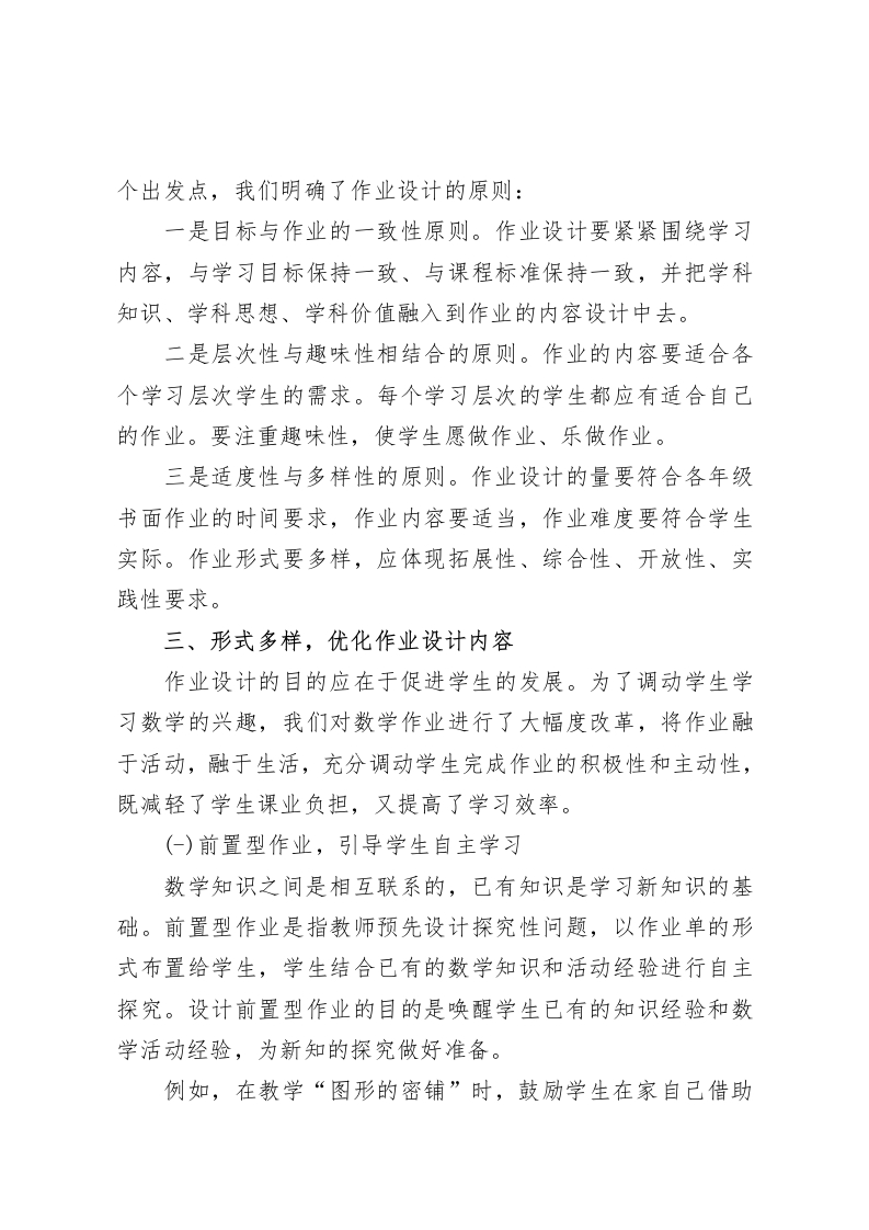 双减背景下小学数学作业设计研究根据教育部门扎实推进“双减”工作落地见效的工作精神,为进一步减轻学生的课业负担,数学教师要紧紧围绕学科核心素养要求,整体设计课内外的学习活动;要把课外作业和课堂教学有机结合起来,以少而精的高质量作业取代简单、机械、重复性的大量作业,达到”减负增效”目的;要使作业真正为教学服务,为素质教育服务,使之有利于学生知识、能力、综合素质的发展。一、提高认识,更新作业设计理念作业作为课程与教学活动的重要组成部分,目前在作业的设计方面仍存在一些问题,如作业形式枯燥、单调、僵化;作业评价缺乏层次性和针对性等,长此以往将会降低学生学习数学的积极性和有效性。作为教师我们应积极、正确地看待作业改革,努力探讨如何布置能有效布置作业,努力提高学生学习数学的积极性,使其形成数学学习方法,发展数学思维,增强数学问题解决能力。二、整体把握,明确作业设计原则通过作业改革,我们希望数学教师通过学生的作业及时了解教学效果,找出现状和预期状态之间的差距,发现其存在的问题,以便于及时改进教学方法,降低教学难度和调整教学进度;通过作业学生了解自己知识、技能的掌握情况,激发他们的学习热情,使其更积极地投入到今后的学习之中去。基于这