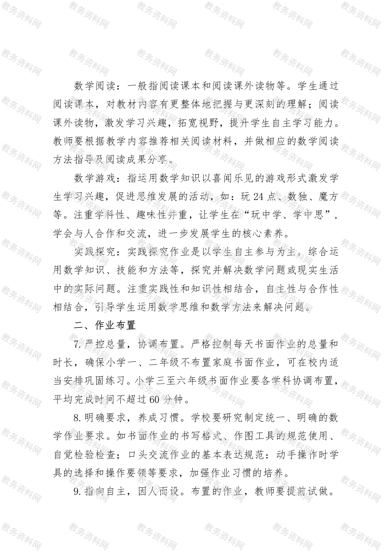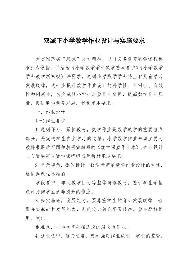 双减下小学数学作业设计与实施要求为贯彻落实“双减”文件精神,以《义务教育数学课程标准》为依据,并结合《小学数学学科教学基本要求》《小学数学学科教学新常规》等要求,遵循小学数学学科特点和儿童学习发展规律,进一步提升数学作业设计的科学性、针对性、有效性和创新性,切实减轻小学生过重作业负担,提高数学作业质量,促进数学素养发展,特制定本要求。一、作业设计(一)作业要求1.遵循课标,紧扣教材。数学作业是数学教学的重要组成部分,是促进学生自主学习的过程。小学数学作业来源主要为教科书课后习题和教研室编写的《数学课堂作业本》,作业设计与布置要符合数学课程标准及教材规范要求。2.单元视角,整体设计。数学教师是数学作业设计的主体,要依据课程标准的学段要求、单元教学目标等整体研读教材,基于学生学情设计指向学生素养提升的作业。3.夯实基础,发展能力。要尊重学生的身心发展规律,着眼夯实基础和发展能力,系统设计符合学习规律、重在迁移运用、突出重难点、与学生基础相适应的层次性作业。4.分量适中,难易适度。要加强对作业数量、质量的监管,