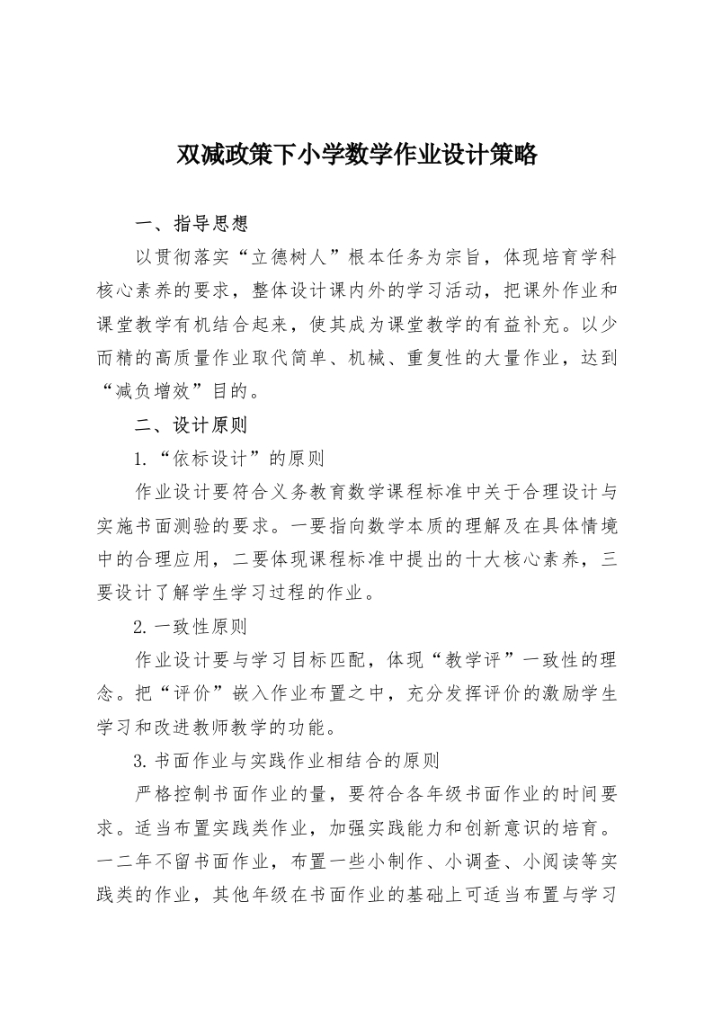 双减政策下小学数学作业设计策略一、指导思想以贯彻落实“立德树人”根本任务为宗旨,体现培育学科核心素养的要求,整体设计课内外的学习活动,把课外作业和课堂教学有机结合起来,使其成为课堂教学的有益补充。以少而精的高质量作业取代简单、机械、重复性的大量作业,达到“减负增效”目的。二、设计原则1.“依标设计”的原则作业设计要符合义务教育数学课程标准中关于合理设计与实施书面测验的要求。一要指向数学本质的理解及在具体情境中的合理应用,二要体现课程标准中提出的十大核心素养,三要设计了解学生学习过程的作业。2.一致性原则作业设计要与学习目标匹配,体现“教学评”一致性的理念。把“评价”嵌入作业布置之中,充分发挥评价的激励学生学习和改进教师教学的功能。3.书面作业与实践作业相结合的原则严格控制书面作业的量,要符合各年级书面作业的时间要求。适当布置实践类作业,加强实践能力和创新意识的培育。一二年不留书面作业,布置一些小制作、小调查、小阅读等实践类的作业,其他年级在书面作业的基础上可适当布置与学习