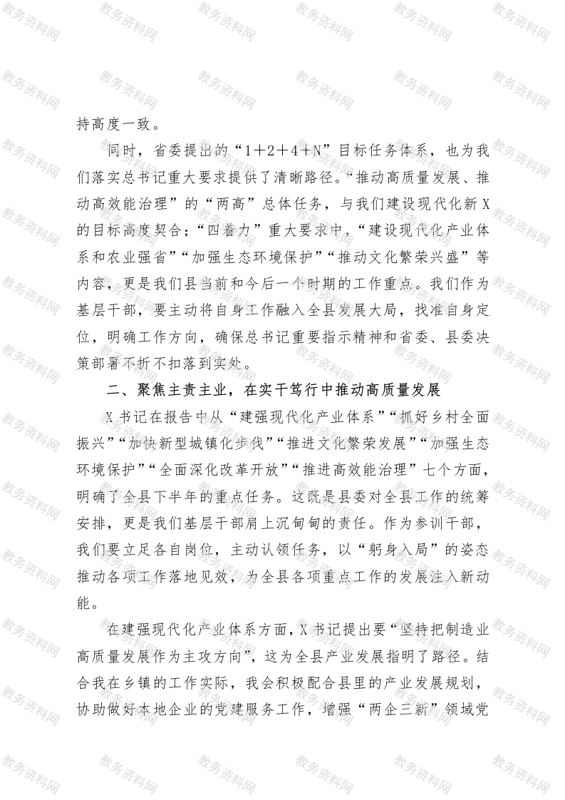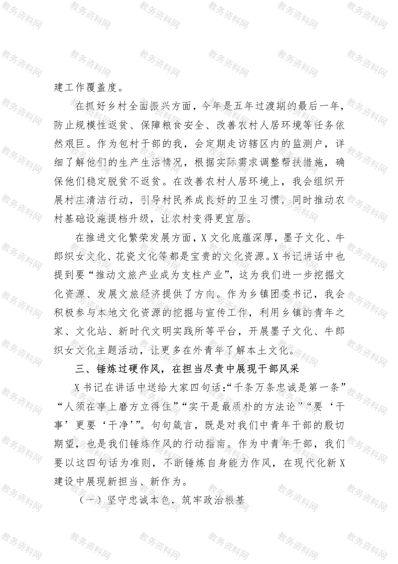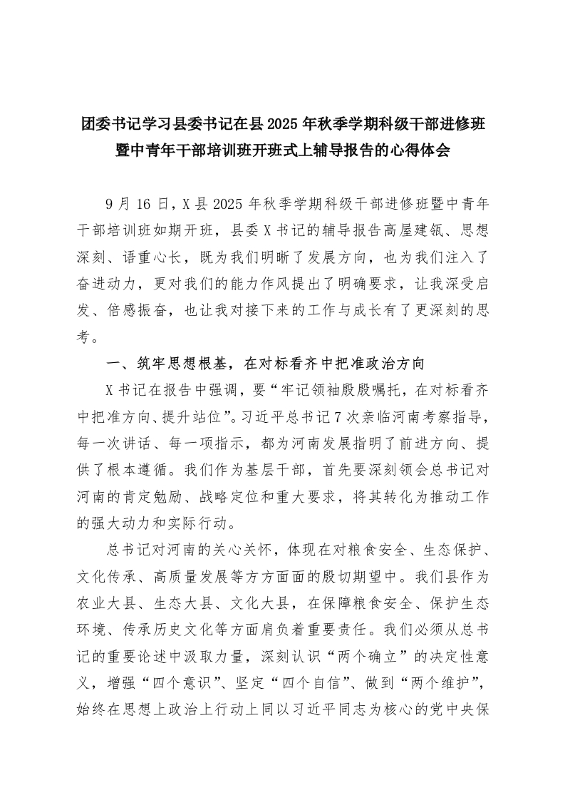 团委书记学习县委书记在县2025年秋季学期科级干部进修班暨中青年干部培训班开班式上辅导报告的心得体会9月16日,X县2025年秋季学期科级干部进修班暨中青年干部培训班如期开班,县委X书记的辅导报告高屋建瓴、思想深刻、语重心长,既为我们明晰了发展方向,也为我们注入了奋进动力,更对我们的能力作风提出了明确要求,让我深受启发、倍感振奋,也让我对接下来的工作与成长有了更深刻的思考。一、筑牢思想根基,在对标看齐中把准政治方向X书记在报告中强调,要“牢记领袖殷殷嘱托,在对标看齐中把准方向、提升站位”。习近平总书记7次亲临河南考察指导,每一次讲话、每一项指示,都为河南发展指明了前进方向、提供了根本遵循。我们作为基层干部,首先要深刻领会总书记对河南的肯定勉励、战略定位和重大要求,将其转化为推动工作的强大动力和实际行动。总书记对河南的关心关怀,体现在对粮食安全、生态保护、文化传承、高质量发展等方方面面的殷切期望中。我们县作为农业大县、生态大县、文化大县,在保障粮食安全、保护生态环境、传承历史文化等方面肩负着重要责任。我们必须从总书记的重要论述中汲取力量,深刻认识“两个确立”的决定性意义,增强“四个意识”、坚定“四个自信”、做到“两个维护”,始终在思想上政治上行动上同以习近平同志为核心的党中央保
