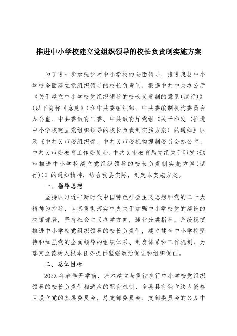 推进中小学校建立党组织领导的校长负责制实施方案为了进一步加强党对中小学校的全面领导,推进我县中小学校全面建立党组织领导的校长负责制,根据中共中央办公厅《关于建立中小学校党组织领导的校长负责制的意见(试行)》(以下简称《意见》)和中共委组织部、中共委编制机构委员会办公室、中共委教育工委、中共教育厅党组《关于印发〈推进中小学校建立党组织领导的校长负责制实施方案〉的通知》以及《中共X市委组织部、中共X市委机构编制委员会办公室、中共X市委教育工作委员会、中共X市教育局党组关于印发〈《X市推进中小学校建立党组织领导的校长负责制实施方案(试行)》》的通知精神,结合我县实际,制定本实施方案。一、指导思想坚持以习近平新时代中国特色社会主义思想和党的二十大精神为指导,认真贯彻落实中央关于加强中小学校党的建设的决策部署,坚持社会主义办学方向,强化分类指导,系统稳慎推进中小学校党组织领导的校长负责制,建立健全中小学校坚持和加强党的全面领导的组织体系、制度体系和工作机制,为落实立德树人根本任务提供坚强政治保证和组织保证。二、总体目标202X年春季开学前,基本建立与贯彻执行中小学校党组织领导的校长负责制相适应的配套机制,全县具有独立法人资格且设立党的基层委员会、总支部委员会、支部委员会的公办中