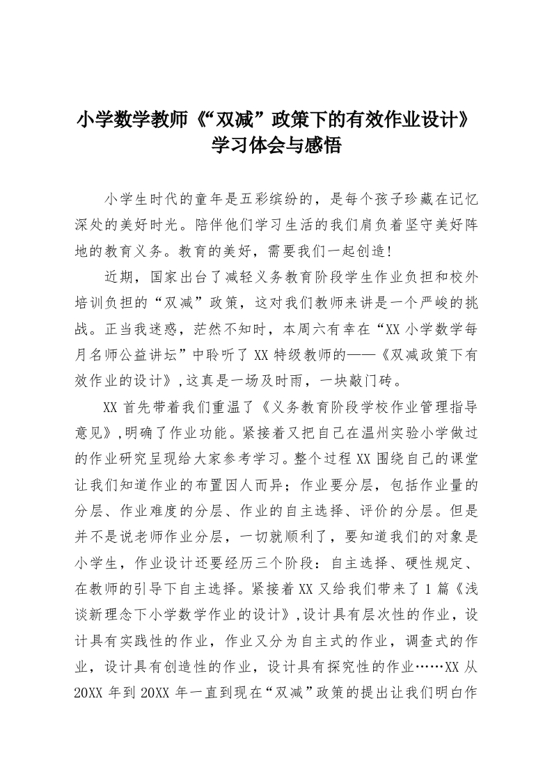 小学数学教师《“双减”政策下的有效作业设计》学习体会与感悟小学生时代的童年是五彩缤纷的,是每个孩子珍藏在记忆深处的美好时光。陪伴他们学习生活的我们肩负着坚守美好阵地的教育义务。教育的美好,需要我们一起创造!近期,国家出台了减轻义务教育阶段学生作业负担和校外培训负担的“双减”政策,这对我们教师来讲是一个严峻的挑战。正当我迷惑,茫然不知时,本周六有幸在“XX小学数学每月名师公益讲坛”中聆听了双特级教师的一一《双减政策下有效作业的设计》,这真是一场及时雨,一块敲门砖。XX首先带着我们重温了《义务教育阶段学校作业管理指导意见》,明确了作业功能。紧接着又把自己在温州实验小学做过的作业研究呈现给大家参考学习。整个过程XX围绕自己的课堂让我们知道作业的布置因人而异;作业要分层,包括作业量的分层、作业难度的分层、作业的自主选择、评价的分层。但是并不是说老师作业分层,一切就顺利了,要知道我们的对象是小学生,作业设计还要经历三个阶段:自主选择、硬性规定、在教师的引导下自主选择。紧接着XX又给我们带来了1篇《浅谈新理念下小学数学作业的设计》,设计具有层次性的作业,设计具有实践性的作业,作业又分为自主式的作业,调查式的作业,设计具有创造性的作业,设计具有探究性的作业…XX从20XX年到20XX年一直到现在“双减”政策的提出让我们明白作