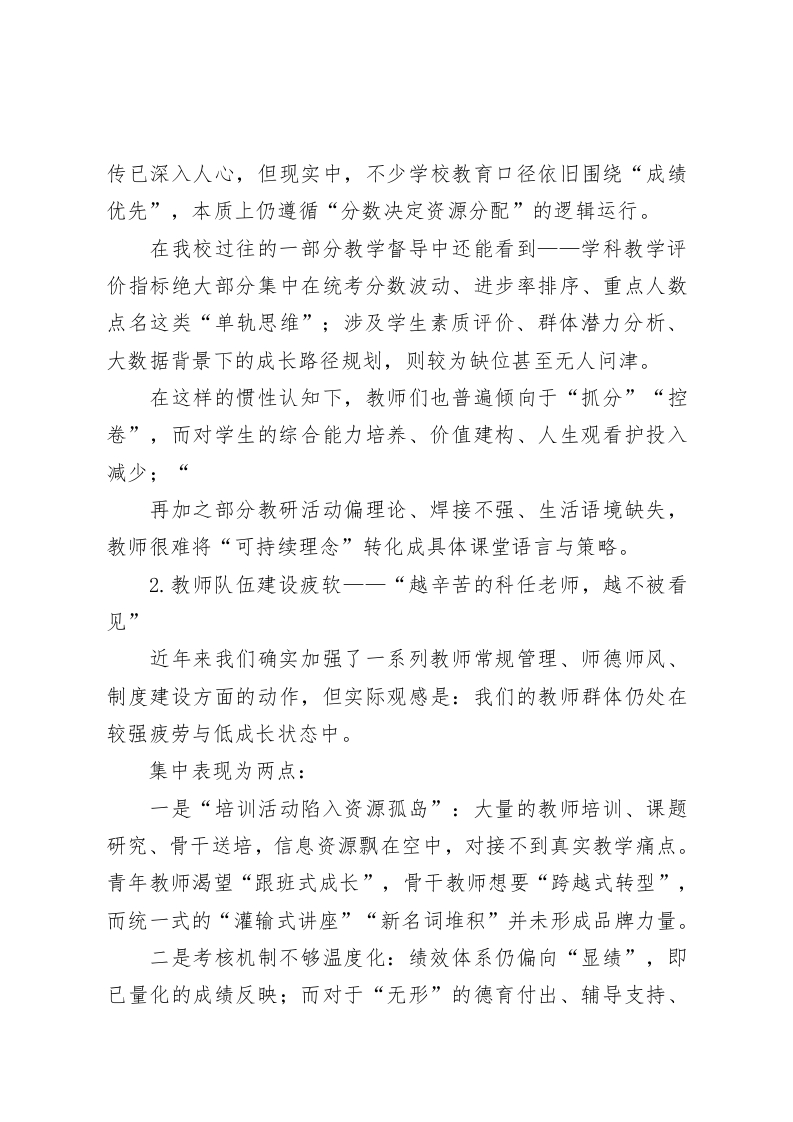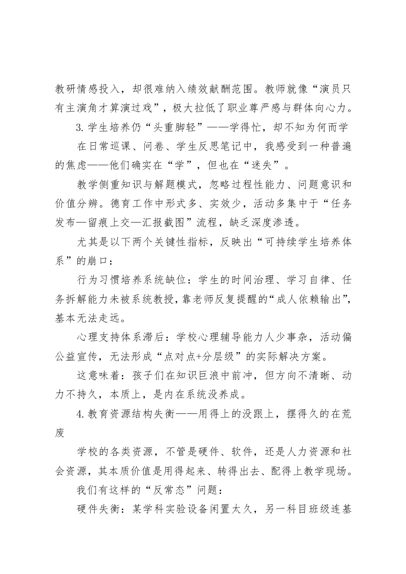 校长岗位反思:在坚守教育初心中探索学校可持续发展之路作为一名基层校长,我深知:我们所承担的不仅是日常事务的统筹与推进,更肩负着“办好人民满意教育”的时代使命。学校的发展,不是一年方案、一场改革可以解决的事,更不是靠几个项目成果就能敷衍过关的工作。它是一项系统性、长期性、策略性与价值性的工程,而“可持续发展”,正是这个系统工程中不可回避的核心目标。从某种意义上说,校长之职就是持续在“开发学校潜力、优化系统结构、守住教育底色、赢得长期信任”几个维度之间反复较劲。而这背后,靠的是认清问题、厘清症结、找准路径、久久为功。今天,我想从“五个层面的反思”入手,坦诚我们在可持续发展道路上的碰壁与焦虑,也尝试提出一些围绕学校战略发展方向的“五项优化思路”,供各位同仁批评指正。一、对当前学校可持续发展状态的集中反思教育不能总靠政策“推动走”,而要转向“内生驱动、自研生长”,这让我们不能不对自己工作现状有一番长期作业式的自查。1.教育思想与理念滞后一一“分数高”的神话,仍未完全散去不可讳言,尽管“关注核心素养”“强调五育并举”的宣