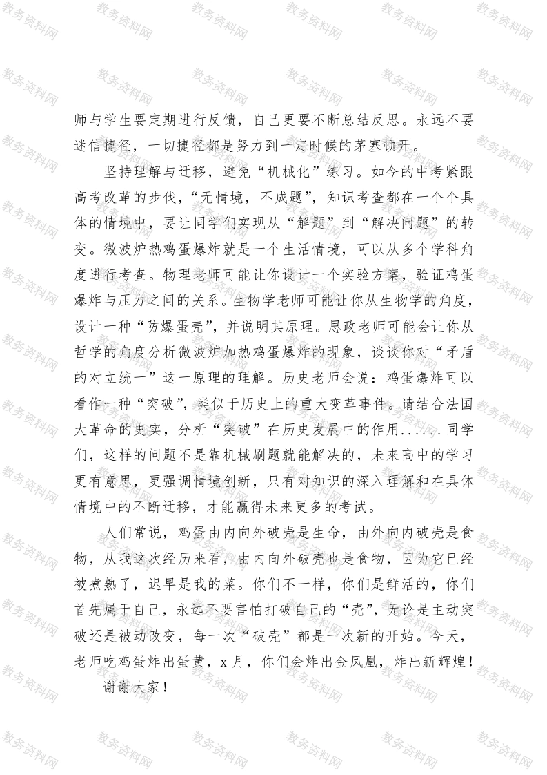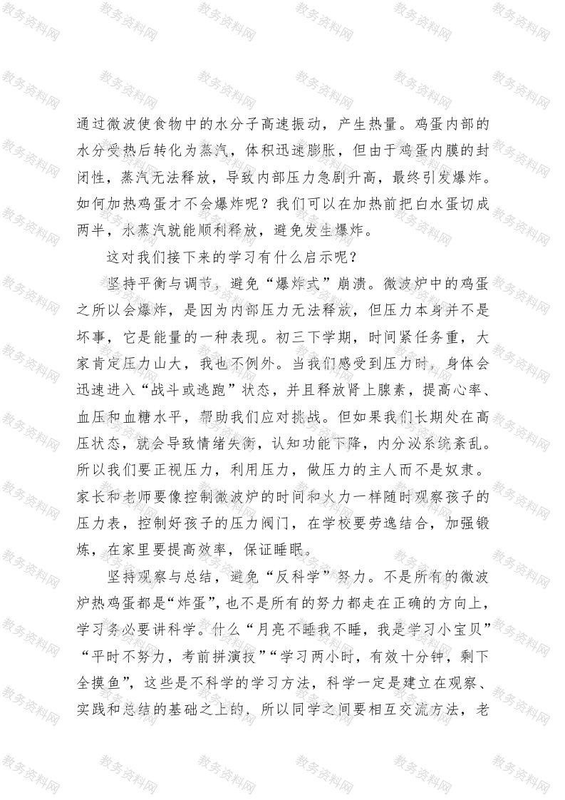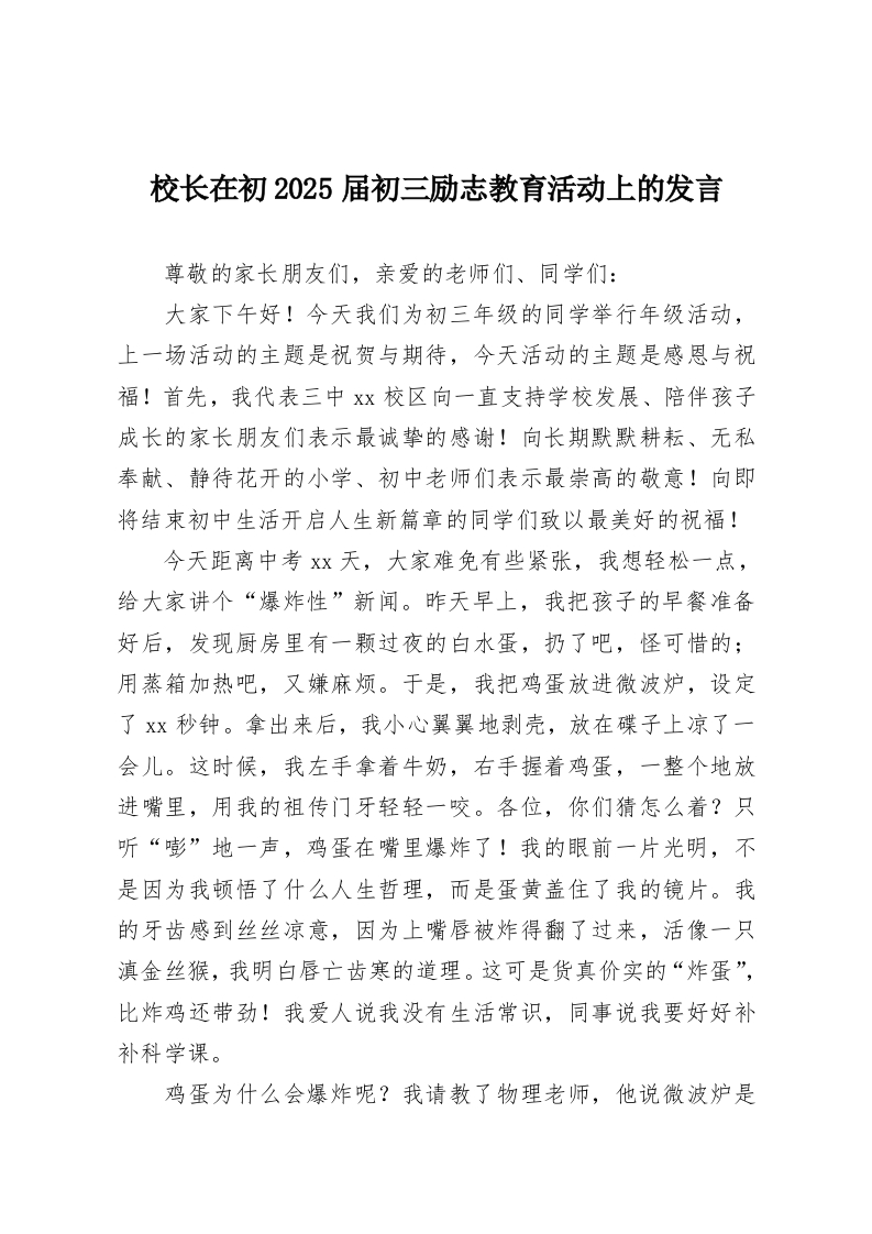 校长在初2025届初三励志教育活动上的发言尊敬的家长朋友们,亲爱的老师们、同学们:大家下午好!今天我们为初三年级的同学举行年级活动,上一场活动的主题是祝贺与期待,今天活动的主题是感恩与祝福!首先,我代表三中xx校区向一直支持学校发展、陪伴孩子成长的家长朋友们表示最诚挚的感谢!向长期默默耕耘、无私奉献、静待花开的小学、初中老师们表示最崇高的敬意!向即将结束初中生活开启人生新篇章的同学们致以最美好的祝福!今天距离中考xx天,大家难免有些紧张,我想轻松一点,给大家讲个“爆炸性”新闻。昨天早上,我把孩子的早餐准备好后,发现厨房里有一颗过夜的白水蛋,扔了吧,怪可惜的;用蒸箱加热吧,又嫌麻烦。于是,我把鸡蛋放进微波炉,设定了xx秒钟。拿出来后,我小心翼翼地剥壳,放在碟子上凉了一会儿。这时候,我左手拿着牛奶,右手握着鸡蛋,一整个地放进嘴里,用我的祖传门牙轻轻一咬。各位,你们猜怎么着?只听“嘭”地一声,鸡蛋在嘴里爆炸了!我的眼前一片光明,不是因为我顿悟了什么人生哲理,而是蛋黄盖住了我的镜片。我的牙齿感到丝丝凉意,因为上嘴唇被炸得翻了过来,活像一只滇金丝猴,我明白唇亡齿寒的道理。这可是货真价实的“炸蛋”,比炸鸡还带劲!我爱人说我没有生活常识,同事说我要好好补补科学课。鸡蛋为什么会爆炸呢?我请教了物理老师,他说微波炉是