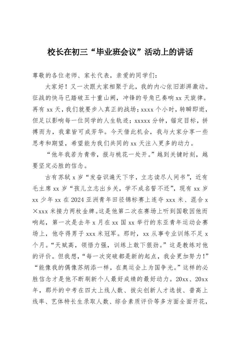 校长在初三“毕业班会议”活动上的讲话尊敬的各位老师、家长代表,亲爱的同学们:大家好!又一次跟大家相聚于此,我的内心依旧澎湃激动。征战的快马已踏破五十重山阙,冲锋的号角已奏响xx天旋律。再有xx天,我们就要步入真正的战场;Xxxx个小时,转瞬即逝,但足以影响每一位同学的人生轨迹;XXXXx分钟,锚定目标,拼搏而为,我辈皆可成芳华。今天借此机会,我与大家分享一些思考和期望,希望能为我们共同的Xx天注入更多的动力。“他年我若为青帝,报与桃花一处开。”越到关键时刻,越要坚定必胜的信念。古有苏轼x岁“发奋识遍天下字,立志读尽人间书”,近有毛主席xx岁“孩儿立志出乡关,学不成名誓不还”,现有Xx岁xx少年Xx在2024亚洲青年田径锦标赛上连夺xxx米、混合xXxxx米接力两枚金牌。这是他第二次在赛场上听到国歌因他而响起,第一次是去年X月在Xx国Xx举行的东亚青年运动会赛场上,他夺得男子xxx米冠军。那时,xx从事专业训练不足x个月。“天赋高,领悟力强,训练上敢下狠劲。”这是教练对他的评价。但我想,“每一次突破都是新的起点,我会更加努力!”“能像我的偶像苏炳添一样,在奥运会上为国争光。”这样的必胜信念才是他不断刷新个人最好成绩的最好动力。20xx、20xx年,郡外的中考在四大上线人数、拔尖创新人才选拔、普高上线率、艺体特长生录取人数、综合素质评价等多方面全面开花,