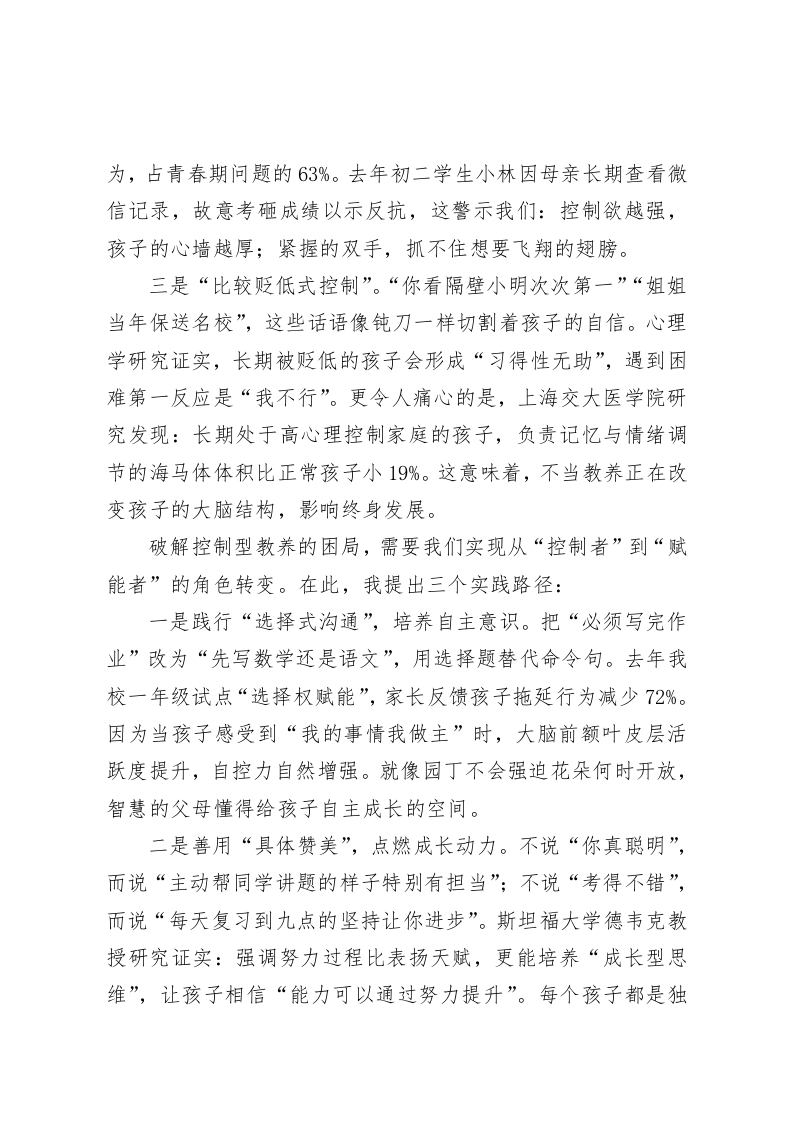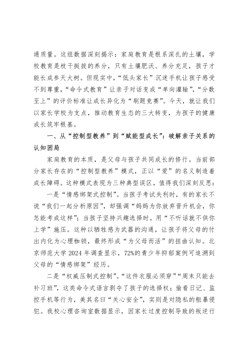 校长在家长学校成立大会上的致辞:3大转变构建协同育人新格局一从“孤军奋战”到“家校同心”的教育突围尊敬的各位来宾、各位家长朋友:大家上午好!今天,我们以教育的名义相聚,共同见证家长学校的成立盛典。首先,我谨代表学校全体师生,向莅临指导的市区领导、教育专家致以崇高敬意!向当选的286名家长代表表示热烈祝贺!你们肩负着全校2000个家庭的教育期盼,承载着上万名家长的育人重托。此刻,我们站在家庭教育促进法实施三周年的历史节点,站在教育部“教联体”改革的实践前沿,共同开启从“学校单打独斗”到“家校协同作战”的教育新征程。家长走进校园,过去多为“问分数、看排名”的焦虑之旅:今天我们相聚,要开启“学方法、共成长”的赋能之路。在这里,我们不做推卸责任的“甩手掌柜”,不当制造焦虑的“施压者”,要成为懂教育规律的“同盟军”、会情感沟通的“引路人”。2021年《家庭教育促进法》首次将“家事”上升为“国事”,2024年十七部门联合印发的“教联体”方案明确提出“家校社协同育人”的刚性要求。这意味着,孩子的成长不再是学校的“独角戏”,而是需要家校双方以“教育合伙人”的姿态,共同谱写的“协奏曲”。中国人民大学俞国良教授团队十年追踪研究显示:学生幸福感的70%来自和谐的家庭关系,学业成就的40%取决于亲子沟