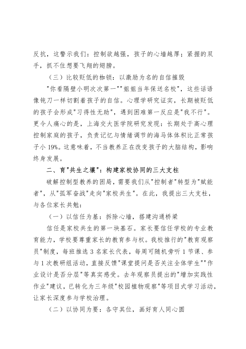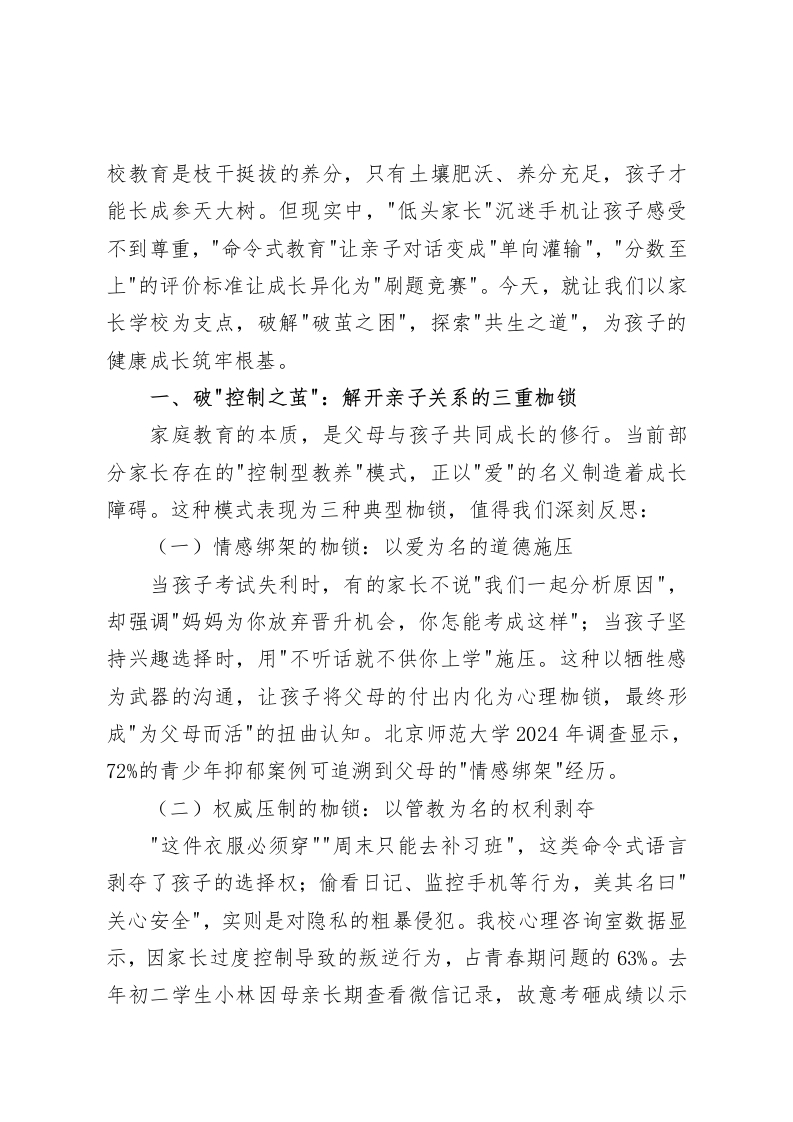 校长在家长学校成立大会上的致辞:破茧与共生一一家校携手的育人之道尊敬的各位来宾、各位家长朋友:大家上午好!今天,我们以教育的名义相聚于此,共同见证家长学校的成立盛典。首先,我谨代表学校全体师生,向莅临指导的市区领导、教育专家致以崇高敬意!向当选的家长代表致以诚挚问候!此刻,我们站在家庭教育促进法实施三周年的历史节点,站在"家校社协同育人"的改革前沿,共同思考一个命题:当"望子成龙"的期待遇上"拔苗助长"的焦虑,当"分数至上"的执念碰撞"全面发展"的初心,我们该如何为孩子的成长破茧,又该如何实现家校的共生?家长走进校园,过去多是"问分数、看排名"的焦虑之旅:今天我们相聚,要开启"学方法、共成长"的赋能之路。在这里,我们不做推卸责任的"甩手掌柜”,不当制造焦虑的"施压者”,要成为懂教育规律的"同盟军"、会情感沟通的"引路人"。2021年《家庭教育促进法》首次将"家事"上升为"国事",2024年十七部门联合印发的"教联体"方案明确提出"家校社协同育人"的刚性要求。这意味着,孩子的成长不再是学校的"独角戏",而是需要家校双方以"教育合伙人"的姿态,共同谱写的"协奏曲”。中国人民大学俞国良教授团队十年追踪研究显示:学生幸福感的70%来自和谐的家庭关系,学业成就的40%取决于亲子沟通质量。这组数据深刻揭示:家庭教育是根系深扎的土壤,学