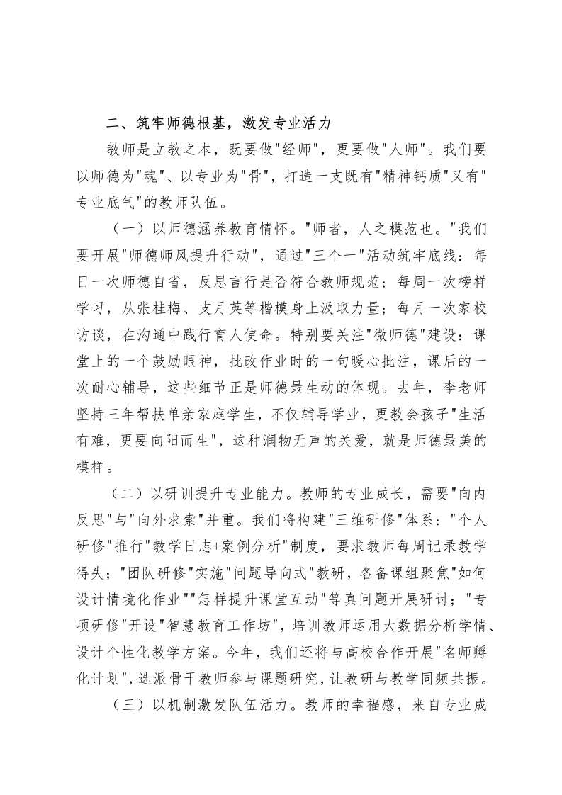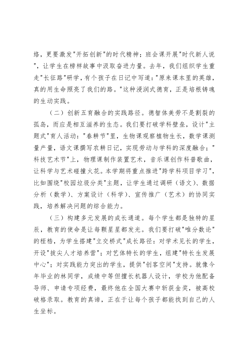 校长在全体教师大会上发言:守正立根铸师魂,创新赋能育新人各位老师:上午好!当晨雾中的教学楼透出第一缕灯光,当教案本上的批注凝结着教育智慧,当暮色里的办公室传来讨论声一一我总会想起蔡元培先生的话:"教育者,非为已往,非为现在,而专为将来。"这句话道出了教育的本质:既要坚守立德树人的”正道",又要永葆改革创新的"锐气"。今天,我们齐聚一堂,共同探讨一个命题:在传承与变革的交汇点上,如何以"守正"之心筑牢教育根基,以"创新”之力激活育人效能。首先,请允许我代表学校,向每一位在教育沃土上默默耕耘的同仁致敬:是你们用初心守护讲台,用匠心浇灌成长,让这所学校始终涌动着生生不息的教育力量。一、坚守育人初心,创新育人范式教育的永恒命题,在于如何在不变的育人本质中回应时代的变化。我们既要锚定”培养什么人"的根本方向,又要探索"怎样培养人"的实践路径,构建传统与现代交融的育人新格局。(一)守牢培根铸魂的育人根基。"才者,德之资也;德者,才之帅也。"我们要将思政教育融入教育教学全过程,让红色基因融入血脉。语文课讲《红岩》,不仅分析文学手法,更要传递"宁死不屈"的革命气节;历史课讲改革开放,既要梳理发展脉