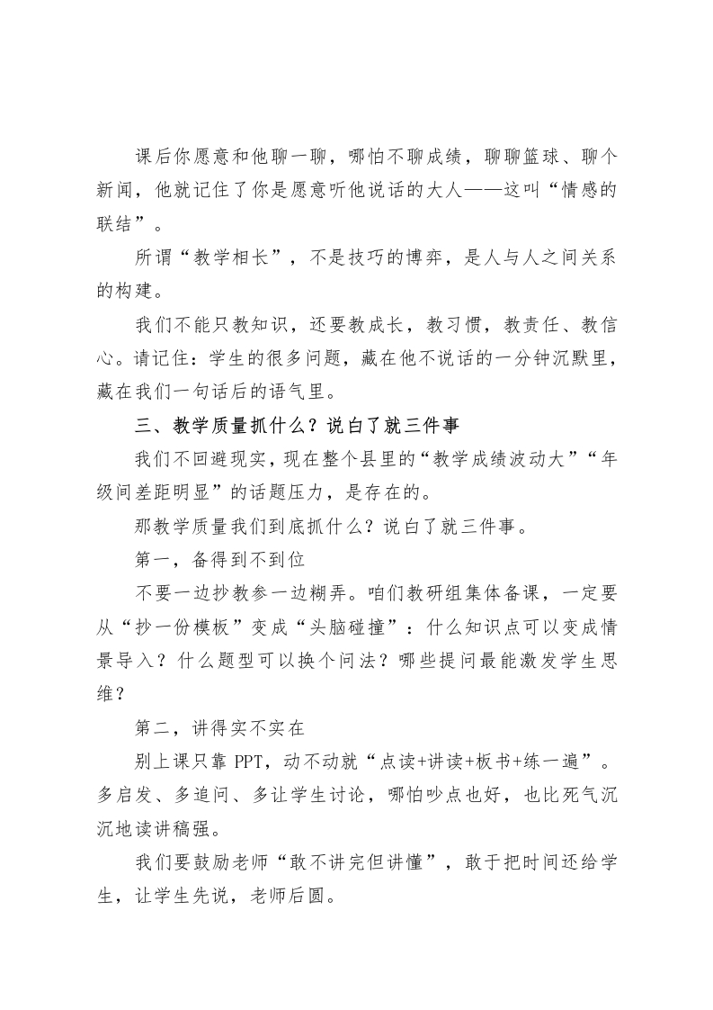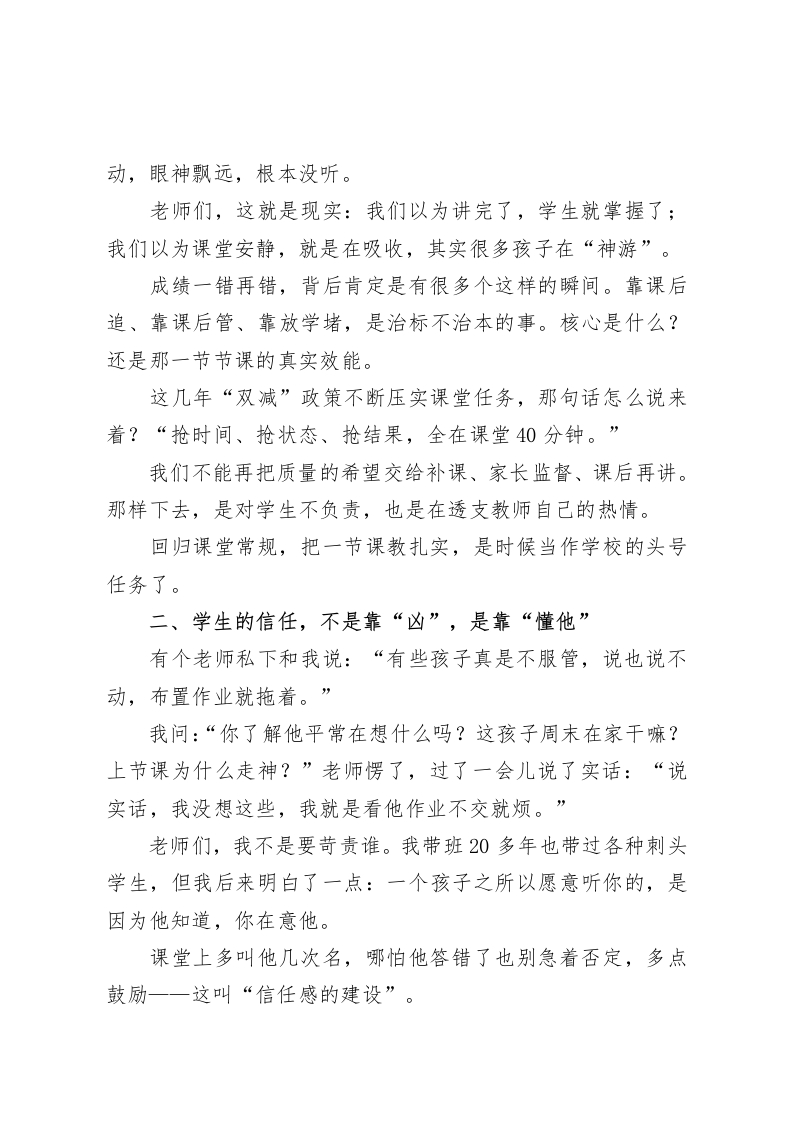校长在全体教师大会上讲话:坚守讲台初心,回归教育本质—一回看每一节课,我们真的“上对了”吗?各位老师:大家上午好!我们常说开学伊始要抓质量、开好局,可说实话,这段时间我一直在思考一个问题:我们教得够不够扎实?还是看似忙碌热闹,其实成效平平?前几天我在教学楼转了一圈,看到早晨六点半,有老师在办公室一边啃着馒头一边备课;晚上七点多,有班主任还在和学生谈心,语速很慢,怕孩子误会。那一刻,我不只是感动,而是还有点沉重。我们太多老师,太辛苦了,拼在一线,却被外界一句“孩子成绩上不去,是老师不会教”轻易否定。教育苦,教师难,但越是这个时候,我们越得稳住心、守住责、沉住气。今天这个会,我就讲一件事:落实教学质量,抓住关键环节。我想跟大家一起想一想,我们的课,到底该怎么上,我们的学生,到底该怎么教,我们的未来,到底靠什么拼。一、成绩从来不是“管”出来的,是课堂“上”出来的我最近在听课的时候,印象最深的是一个场景:一位老师板书完知识点,回头问班上:“大家都听懂了吗?”底下学生齐刷刷点头。然后转身继续讲。我站在教室后门,看着一个坐在最后排的孩子,他嘴巴在
