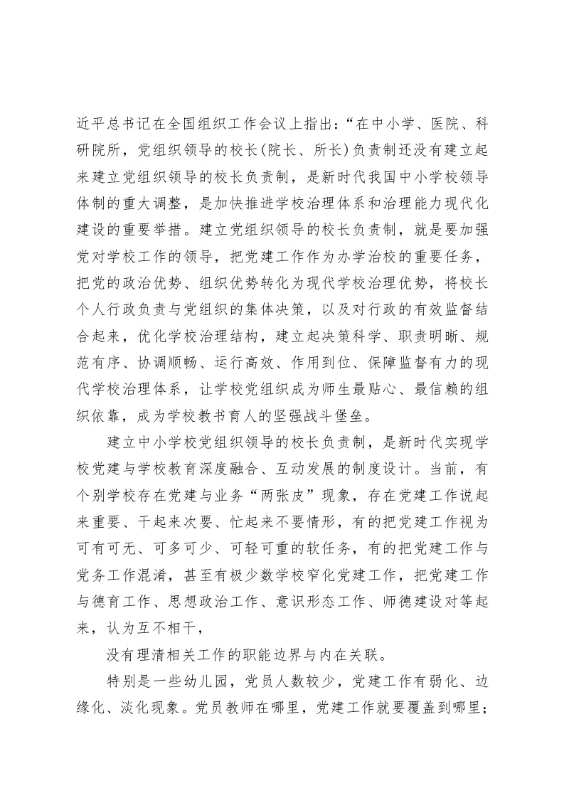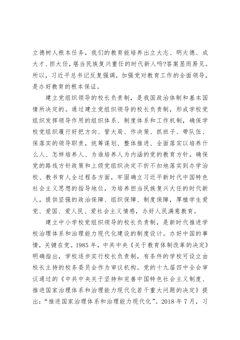 学习《关于建立中小学校党组织领导的校长负责制的意见(试行)》心得体会近日,中共中央办公厅印发了《关于建立中小学校党组织领导的校长负责制的意见(试行)》,并发出通知,要求各地区各部门结合实际认真贯彻落实。通知指出,加强党对教育工作的全面领导是办好教育的根本保证。建立中小学校党组织领导的校长负责制,是坚持为党育人、为国育才,保证党的教育方针和党中央决策部署在中小学校得到贯彻落实的必然要求。这一制度的建立,为加强党对教育工作的全面领导,全面贯彻党的教育方针,坚持为党育人、为国育才,培养德智体美劳全面发展的中国特色社会主义事业合格建设者和可靠接班人,提供了根本的制度保障。建立中小学校党组织领导的校长负责制,是新时代确保党的教育方针和党中央决策部署在中小学校得到全面贯彻落实的制度设计。我国是中国共产党领导的有中国特色的社会主义国家,办的是有中国特色的社会主义教育,需要的是中国特色社会主义事业的建设者和接班人。2021年4月,习近平总书记在考察清华大学时强调指出,我国社会主义教育就是要培养德智体美劳全面发展的社会主义建设者和接班人。最根本的就是要全面贯彻党的教育方针,解决好培养什么人、怎样培养人、为谁培养人这个根本问题。如果不坚持好社会主义办学方向、不贯彻好党的教育方针、不执行好党的路线方针政策、不落实好