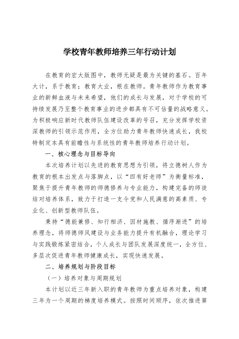 学校青年教师培养三年行动计划在教育的宏大版图中,教师无疑是最为关键的基石。百年大计,系于教育;教育大业,根在教师。青年教师作为教育事业的新鲜血液与未来希望,他们的成长与发展,对于学校的可持续发展乃至整个教育事业的进步都具有不可估量的战略意义。为积极响应新时代教师队伍建设改革的号召,充分发挥学校资深教师的引领示范作用,全方位助力青年教师快速成长,我校特制定本具有前瞻性与系统性的青年教师培养行动计划。一、核心理念与目标导向本次培养计划以先进的教育思想为引领,将立德树人作为教育的根本出发点与落脚点,以“四有好老师”为衡量标准,聚焦于提升青年教师的师德修养与专业能力,构建完备的师徒结对培养体系,致力于打造一支令党和人民满意的高素质、专业化、创新型教师队伍。秉持“德能兼修、知行相济、因材施教、循序渐进”的培养理念,将师德师风建设与业务能力提升有机融合,理论学习与实践锻炼紧密结合,个人成长与团队发展深度统一,全方位、多层次促进青年教师健康成长,实现快速发展。二、培养规划与阶段目标(一)培养对象与周期规划本计划以近三年新入职的青年教师为重点培养对象,构建三年为一个周期的梯度培养模式。按照时间顺序,依次推进第