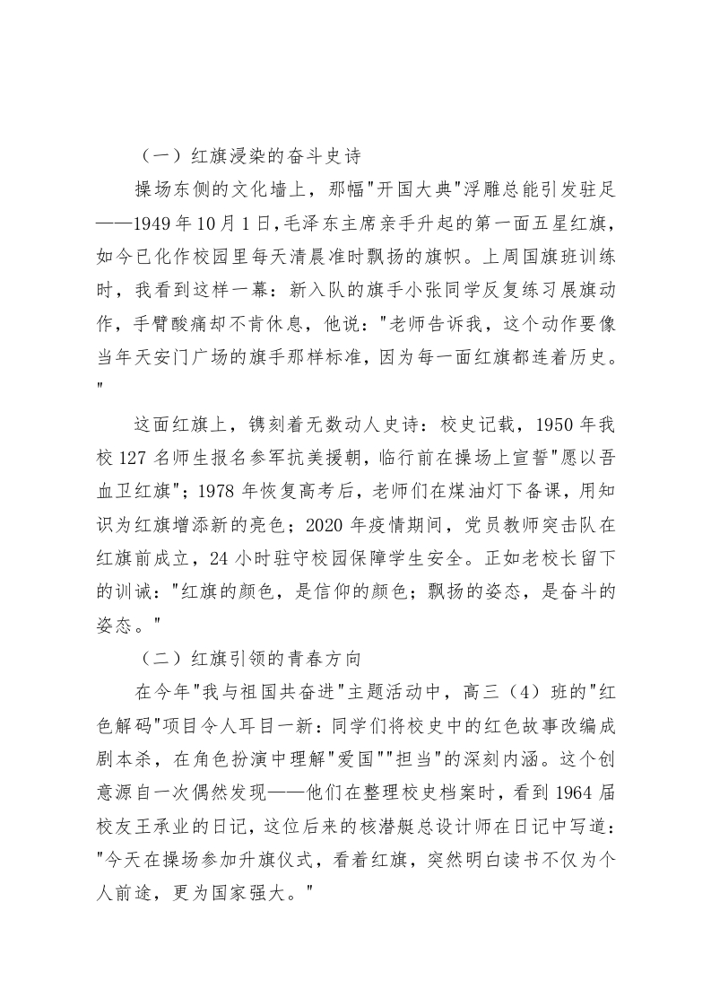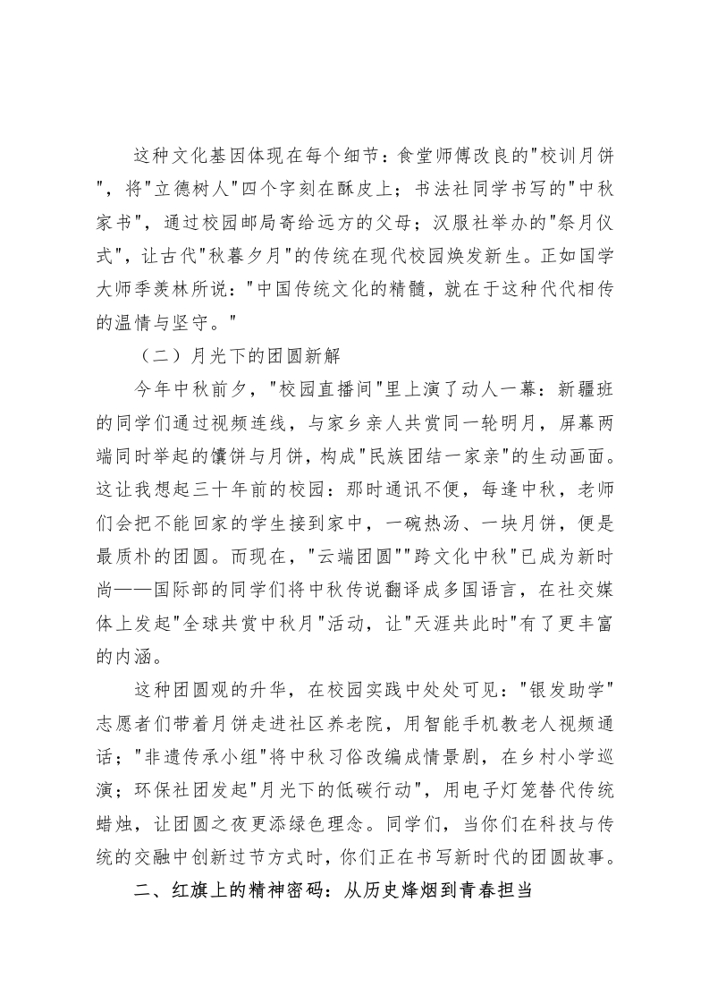 迎中秋庆国庆升旗仪式,校长讲话:月光与红旗的对话—一当传统佳节遇见家国荣光尊敬的老师们,亲爱的同学们:早上好!当晨曦中的五星红旗与天边未尽的月光在苍穹相遇,当国庆的号角与中秋的桂香在校园交织,我们正站在一个充满象征意义的时空节点一一这是农历八月十五的团圆时刻,也是新中国成立76周年的庆典时分。今天,让我们聆听一场跨越千年的对话:那轮照耀过杜甫"露从今夜白"的明月,与这面浸染着无数先烈鲜血的红旗,将向我们诉说怎样的家国故事?当传统佳节的温婉诗意遇见家国荣光的雄浑交响,当代青年又该如何在这场对话中汲取前行的力量?一、月光里的文化根脉:从"婵娟"意象到新时代团圆(一)月光照见的文化基因中秋的月光,是中华文化最温柔的底色。记得去年"中秋诗会”上,初一新生小李同学用稚嫩的声音朗诵"但愿人长久,千里共婵娟"时,台下一位退休教师悄悄擦去眼泪一一这句词她教了整整38年,从粉笔板书到电子白板,变的是教学工具,不变的是文字里流淌的永恒思念。在学校民俗博物馆里,陈列着一件特殊展品:1953年的中秋月饼票,泛黄的纸片上印着"凭票供应"四个字,旁边是当代学生设计的”太空月饼"模型,传统莲蓉馅与3D打印糖艺的碰撞,恰似一场穿越时空的味觉对话。