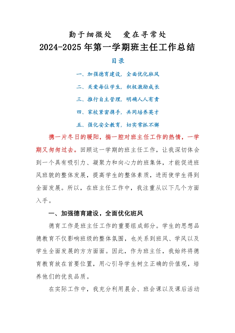勤于细微处爱在寻常处2024-2025年第一学期班主任工作总结目录一、加强德育建设,全面优化班风二、关爱每位学生,积极激励成长三、推行自主管理,明确人人有责四、家校紧密携手,共同培养英才五、强化安全教育,切实常抓不懈携一片冬日的暖阳,揣一腔对班主任工作的热情,一学期又匆匆过去。回顾这一学期的班主任工作,让我深切体会到一个具有吸引力、凝聚力和向心力的班集体,才能促进班风班貌的整体发展,提高学生的整体素质,进而使学生得到全面发展。所以,在班主任工作中,我注重从以下几个方面入手。一、加强德育建设,全面优化班风德育工作是班主任工作的重要组成部分。学生的思想品德教育不仅影响班级的整体氛围,也关系到班风、学风以及学生全面发展的方方面面。因此,作为班主任,我始终将德育教育放在首要位置,用心引导学生树立正确的价值观,培养他们的优良品质。在实际工作中,我充分利用晨会、班会课以及课后活动