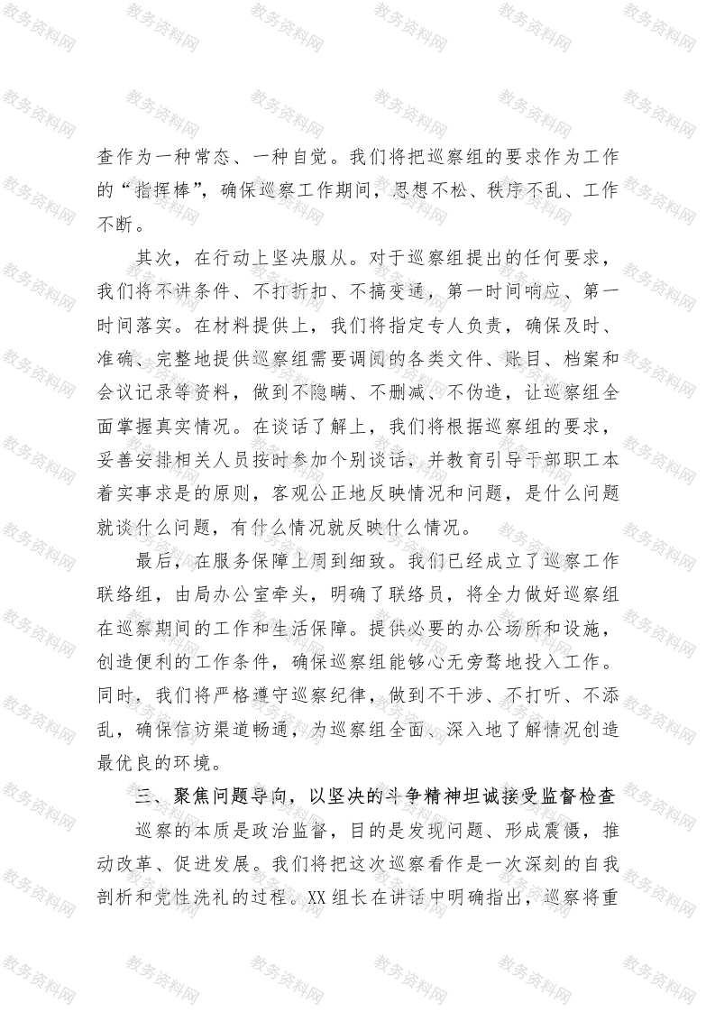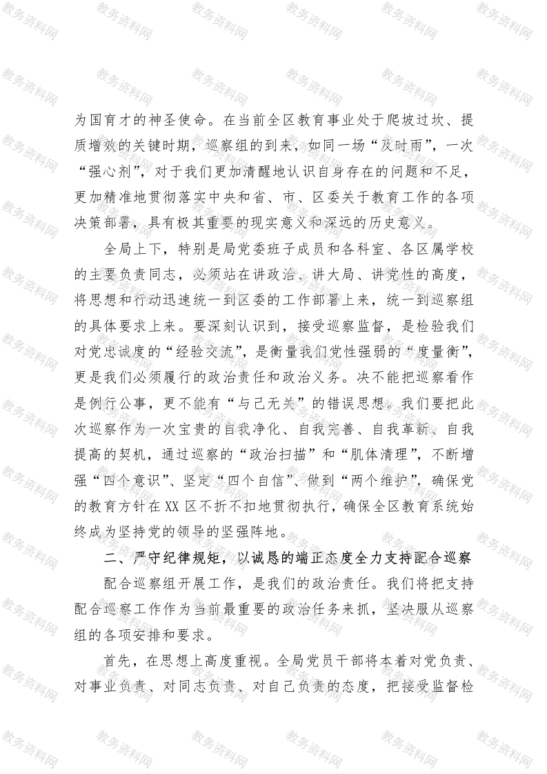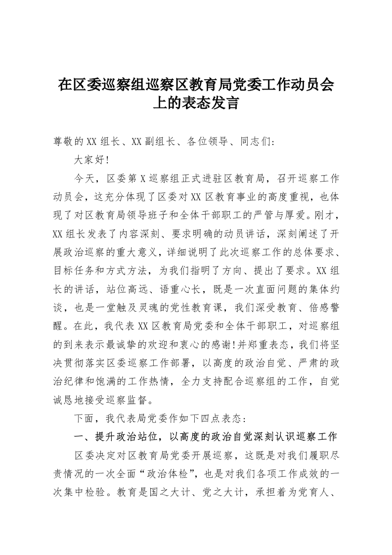 在区委巡察组巡察区教育局党委工作动员会上的表态发言尊敬的XX组长、XX副组长、各位领导、同志们:大家好!今天,区委第X巡察组正式进驻区教育局,召开巡察工作动员会,这充分体现了区委对XX区教育事业的高度重视,也体现了对区教育局领导班子和全体干部职工的严管与厚爱。刚才,XX组长发表了内容深刻、要求明确的动员讲话,深刻阐述了开展政治巡察的重大意义,详细说明了此次巡察工作的总体要求、目标任务和方式方法,为我们指明了方向、提出了要求。XX组长的讲话,站位高远、语重心长,既是一次直面问题的集体约谈,也是一堂触及灵魂的党性教育课,我们深受教育、倍感警醒。在此,我代表XX区教育局党委和全体干部职工,对巡察组的到来表示最诚挚的欢迎和衷心的感谢!并郑重表态,我们将坚决贯彻落实区委巡察工作部署,以高度的政治自觉、严肃的政治纪律和饱满的工作热情,全力支持配合巡察组的工作,自觉诚恳地接受巡察监督。下面,我代表局党委作如下四点表态:一、提升政治站位,以高度的政治自觉深刻认识巡察工作区委决定对区教育局党委开展巡察,这既是对我们履职尽责情况的一次全面“政治体检”,也是对我们各项工作成效的一次集中检验。教育是国之大计、党之大计,承担着为党育人、