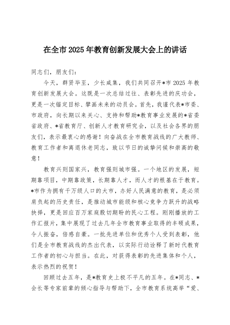 在全市2025年教育创新发展大会上的讲话同志们,朋友们:今天,群贤毕至,少长咸集,我们共同召开*市2025年教育创新发展大会。这既是一次总结过往、表彰先进的庆功会,更是一次锚定目标、擘画未来的动员会。首先,我谨代表*市委、市政府,向长期以来关心、支持和帮助*教育事业发展的*省委省政府、*省教育厅、创新人才教育研究会,以及社会各界的朋友们,表示最衷心的感谢!向奋战在全市教育战线的广大教师、教育工作者和离退休老同志,致以节日的诚挚问候和崇高的敬意!教育兴则国家兴,教育强则城市强。一个地区的发展,短期靠项目,中期靠政策,长期靠人才,而人才的根基在于教育。*市作为拥有千万级人口的大市,办好人民满意的教育,是必须肩负起的历史责任,是推动城市能级和核心竞争力跃升的战略抉择,更是回应百万家庭殷切期盼的民心工程。刚刚播放的工作汇报片,集中展现了过去几年全市教育事业取得的丰硕成果,令人振奋,倍感自豪。一批先进单位和优秀个人受到表彰,他们是全市教育战线的杰出代表,以实际行动诠释了新时代教育工作者的初心与担当。在此,对获得表彰的先进集体和个人,表示热烈的祝贺!回顾过去五年,是*教育史上极不平凡的五年。在*同志、*会长等专家前辈的倾心指导与帮助下,全市教育系统高举“爱、