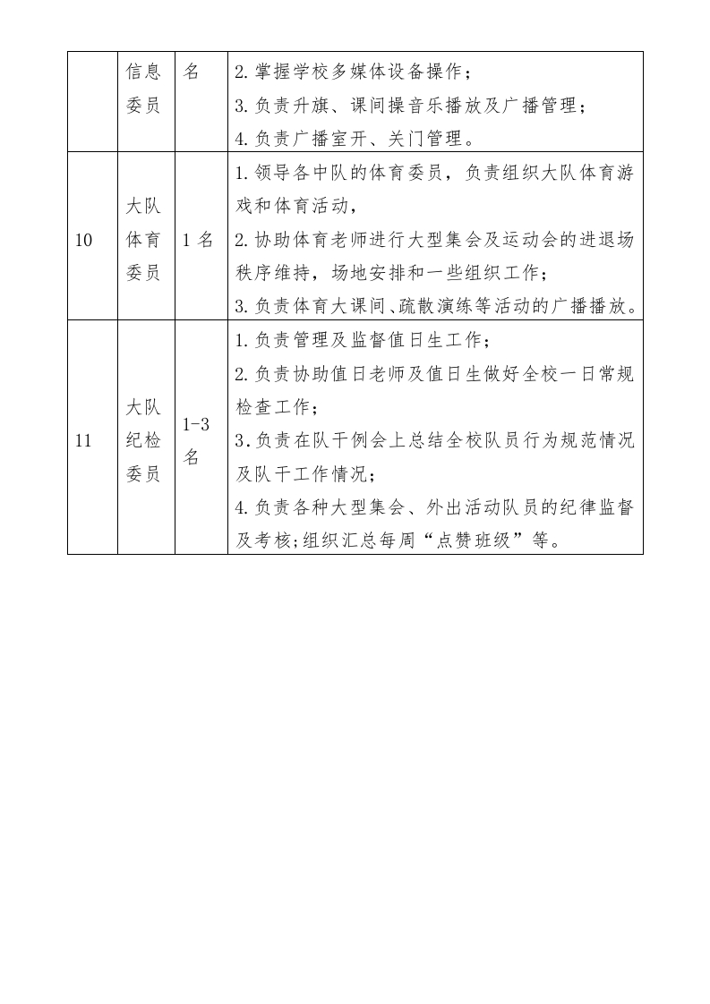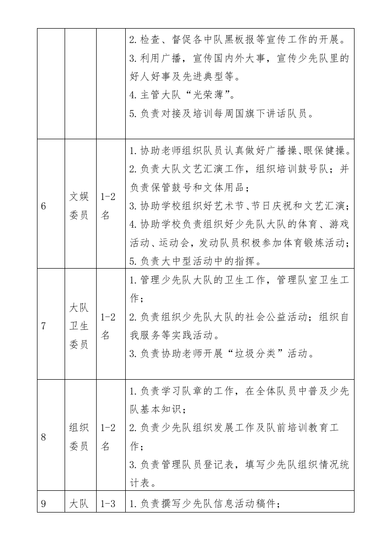大队干部职务名额分配和职责表编职位名额主要工作号1.积极协助大队辅导员的工作。负责上传下达、检查队委会的决议及执行情况,帮助并检查各大大队队委员及中、小队工作。1长1名2.全面负责大队活动,负责主持大队委员会,总结少先队工作,发现存在问题,提出解决办法。3.负责检查每周少先队活动的开展。1.协助、配合大队长工作,做好大队会议记录。副大2-32.负责协助大队长检查各大队委员及中、小队工2队长名作。3.负责检查每周少先队活动的开展。1.负责升旗、降旗,以及雨雪天降旗:2.大队集会时负责出旗、退旗,列队行进时负责执大队旗。34名旗手3.收集每周“升旗手”的资料,训练中队旗手和护旗队员,帮助他们熟悉各自的工作。4.保管队旗,管理各中队领用与归还队旗的工作。1.负责向少先队员推荐好书和报刊,做好订阅报学习1-2刊的工作。4委员名2.负责少先队征文、绘画的评比、作品收集、登记,及有关学习方面的一切事物。宣传1-31.负责宣传工作,管理“点赞公示栏”、黑板报、5委员名宣传栏等宣传阵地。
