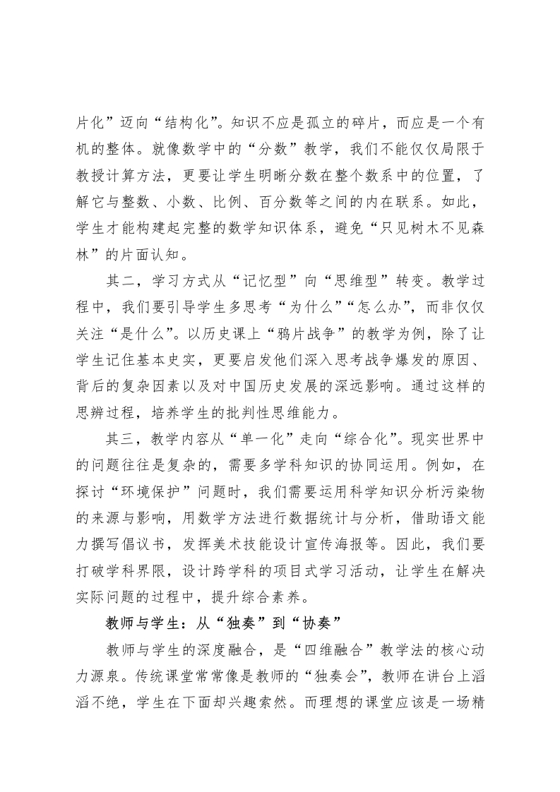 分管教学副校长在全体教师会上讲话:一场会议,让全校99名教师彻夜难眠!尊敬的各位老师:大家好!在这新学年的起点,我们站在教育变革的关键路口。“双减”政策与新课标全面推行的大背景下,如何为学生培育素养生长的“沃土”,已成为我们必须深入思考与积极践行的核心任务。教育家陶行知先生说过“教学做合一”,这深刻地揭示了教育的本质:教学绝非知识的简单传递,而是师生共同构建知识、创造意义的过程。基于此,学校正在研究并推行的“四维融合”教学法,它绝非空中楼阁,而是一套切实可行、能够落地生根的教学行动指南,旨在引领我们的教学由浅入深,实现从知识传授到素养培育的转变。下面,我就为大家详细介绍“四维融合”教学法。知识与素养:从“死记硬背”到“灵活运用”知识与素养的融合,是“四维融合”教学法的根基。一直以来,我们都明白“授人以鱼不如授人以渔”的道理,但在实际教学中,却常常不自觉地陷入只“授鱼”的困境。学生看似记住了公式、定理,会做各种题型,可一旦遇到新的、稍有变化的题目就不知所措。这警示我们,教学不能仅停留在知识的表面灌输,而要致力于将“死知识”转化为“活素养”。实现这一转化,关键在于三个转变。其一,知识结构从“碎