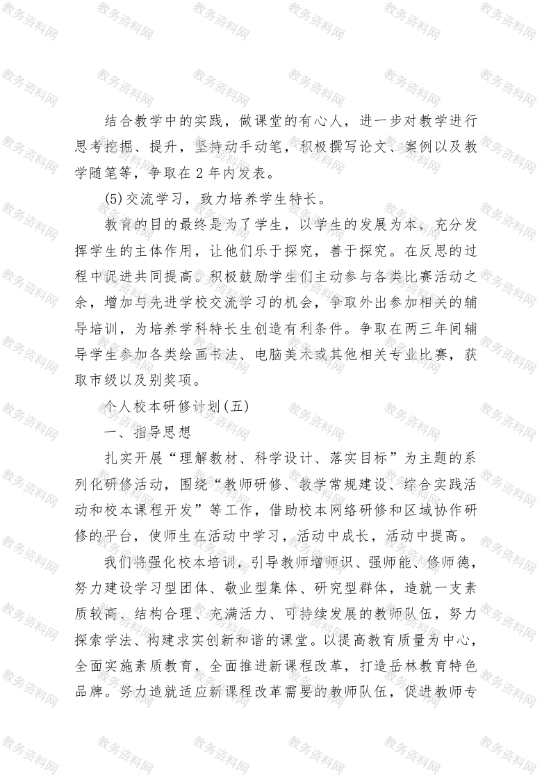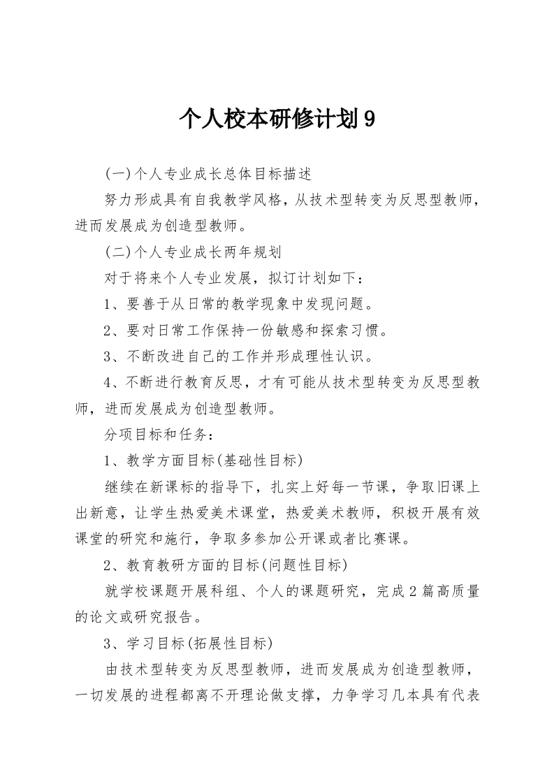 个人校本研修计划9(一)个人专业成长总体目标描述努力形成具有自我教学风格,从技术型转变为反思型教师,进而发展成为创造型教师。(二)个人专业成长两年规划对于将来个人专业发展,拟订计划如下:1、要善于从日常的教学现象中发现问题。2、要对日常工作保持一份敏感和探索习惯。3、不断改进自己的工作并形成理性认识。4、不断进行教育反思,才有可能从技术型转变为反思型教师,进而发展成为创造型教师。分项目标和任务:1、教学方面目标(基础性目标)继续在新课标的指导下,扎实上好每一节课,争取旧课上出新意,让学生热爱美术课堂,热爱美术教师,积极开展有效课堂的研究和施行,争取多参加公开课或者比赛课。2、教育教研方面的目标(问题性目标)就学校课题开展科组、个人的课题研究,完成2篇高质量的论文或研究报告。3、学习目标(拓展性目标)由技术型转变为反思型教师,进而发展成为创造型教师,一切发展的进程都离不开理论做支撑,力争学习几本具有代表