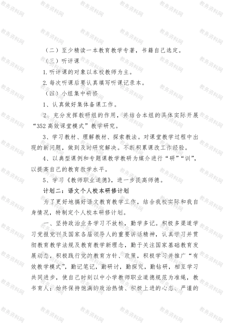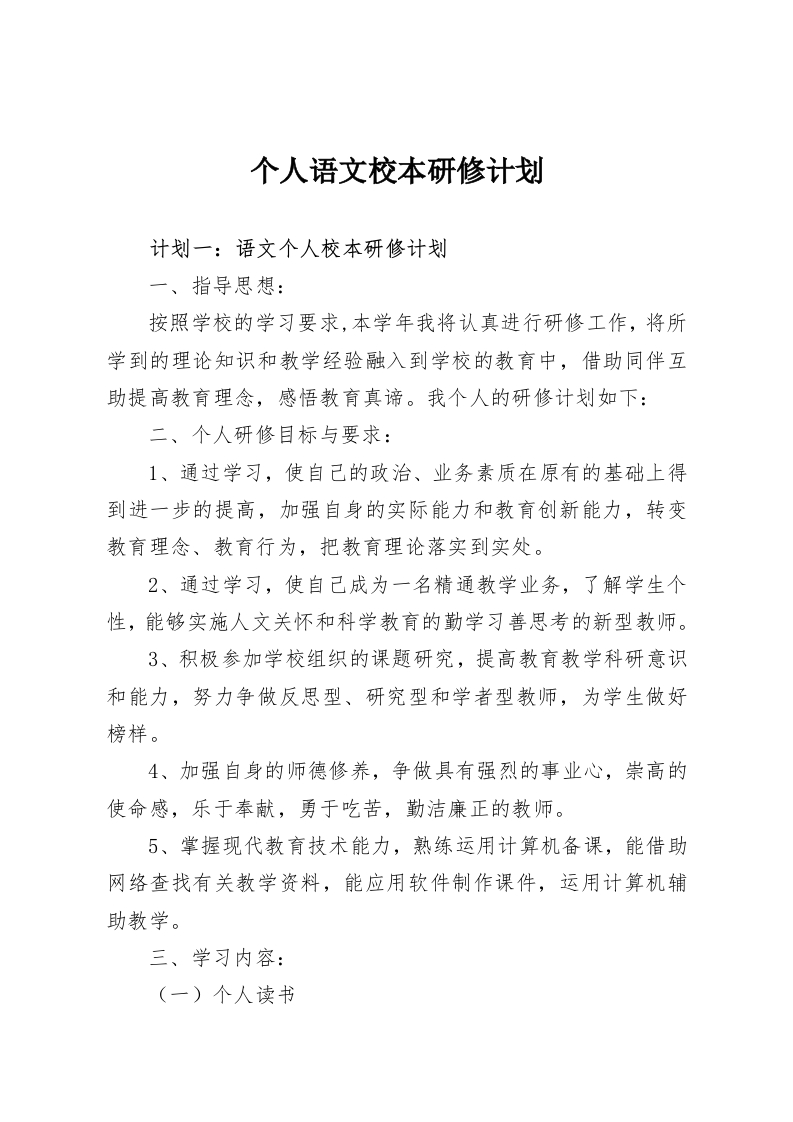个人语文校本研修计划计划一:语文个人校本研修计划一、指导思想:按照学校的学习要求,本学年我将认真进行研修工作,将所学到的理论知识和教学经验融入到学校的教育中,借助同伴互助提高教育理念,感悟教育真谛。我个人的研修计划如下:二、个人研修目标与要求:1、通过学习,使自己的政治、业务素质在原有的基础上得到进一步的提高,加强自身的实际能力和教育创新能力,转变教育理念、教育行为,把教育理论落实到实处。2、通过学习,使自己成为一名精通教学业务,了解学生个性,能够实施人文关怀和科学教育的勤学习善思考的新型教师。3、积极参加学校组织的课题研究,提高教育教学科研意识和能力,努力争做反思型、研究型和学者型教师,为学生做好榜样。4、加强自身的师德修养,争做具有强烈的事业心,崇高的使命感,乐于奉献,勇于吃苦,勤洁廉正的教师。5、掌握现代教育技术能力,熟练运用计算机备课,能借助网络查找有关教学资料,能应用软件制作课件,运用计算机辅助教学。三、学习内容:(一)个人读书