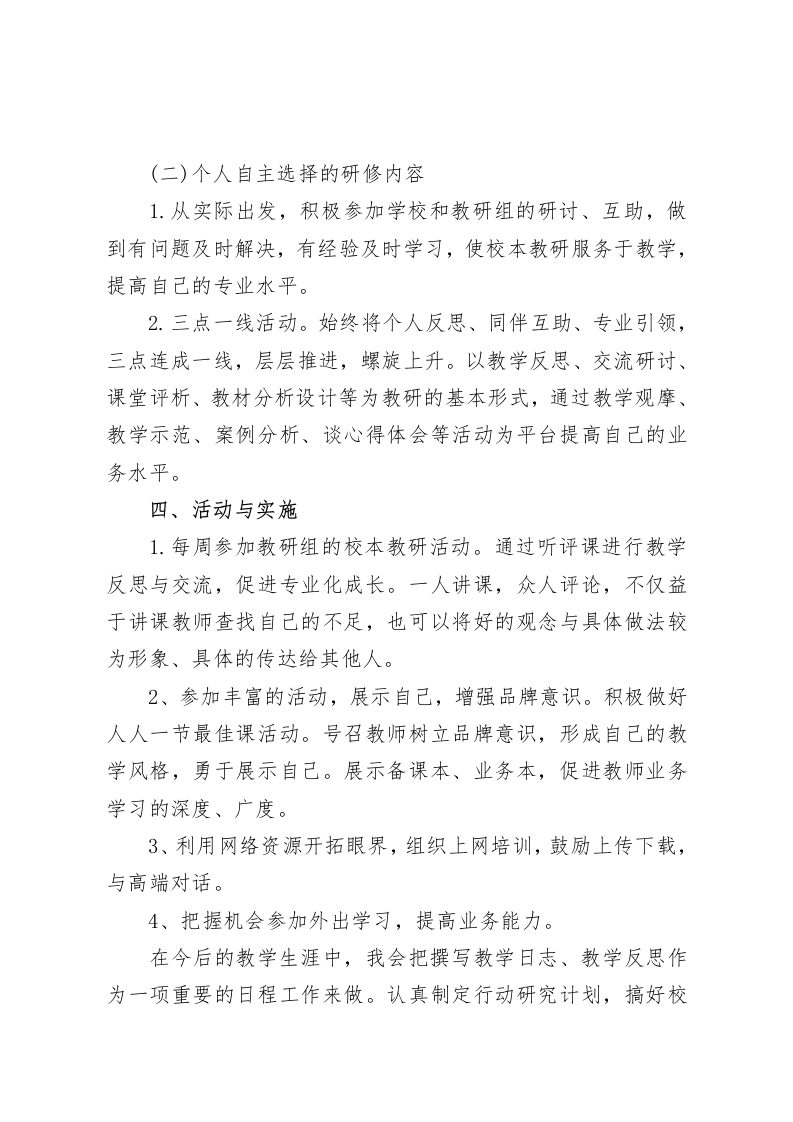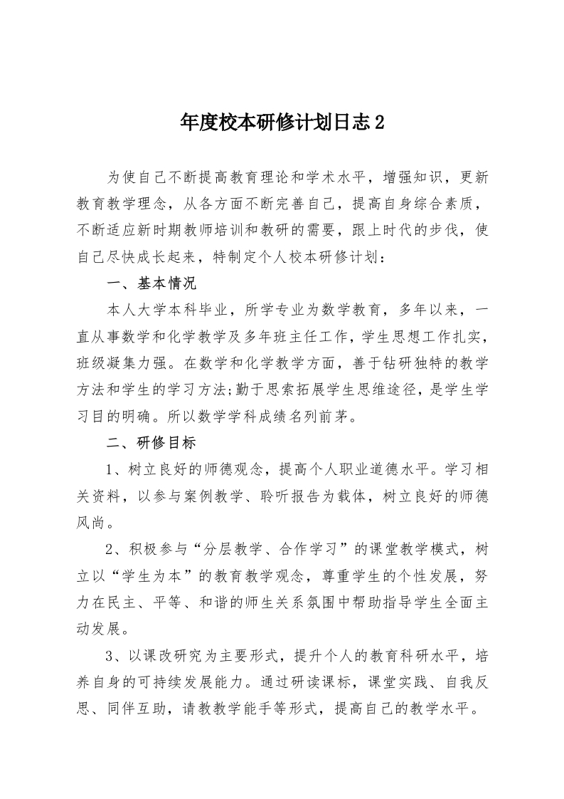 年度校本研修计划日志2为使自己不断提高教育理论和学术水平,增强知识,更新教育教学理念,从各方面不断完善自己,提高自身综合素质,不断适应新时期教师培训和教研的需要,跟上时代的步伐,使自己尽快成长起来,特制定个人校本研修计划:一、基本情况本人大学本科毕业,所学专业为数学教育,多年以来,一直从事数学和化学教学及多年班主任工作,学生思想工作扎实,班级凝集力强。在数学和化学教学方面,善于钻研独特的教学方法和学生的学习方法;勤于思索拓展学生思维途径,是学生学习目的明确。所以数学学科成绩名列前茅。二、研修目标1、树立良好的师德观念,提高个人职业道德水平。学习相关资料,以参与案例教学、聆听报告为载体,树立良好的师德风尚。2、积极参与“分层教学、合作学习”的课堂教学模式,树立以“学生为本”的教育教学观念,尊重学生的个性发展,努力在民主、平等、和谐的师生关系氛围中帮助指导学生全面主动发展。3、以课改研究为主要形式,提升个人的教育科研水平,培养自身的可持续发展能力。通过研读课标,课堂实践、自我反思、同伴互助,请教教学能手等形式,提高自己的教学水平。