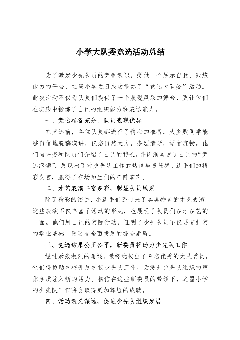 小学大队委竞选活动总结为了激发少先队员的竞争意识,提供一个展示自我、锻炼能力的平台,之墨小学近日成功举办了“竞选大队委”活动。此次活动不仅为队员们提供了一个展现风采的舞台,更让他们在实践中锻炼了自己的组织能力和表达能力。一、竞选准备充分,队员表现优异在竞选前,各位队员都进行了精心的准备。大多数同学能够自信地脱稿演讲,仪态自然大方,条理清晰,语言流畅。他们向评委和队员们介绍了自己的特长,并详细阐述了自己的“竞选纲领”,展现出了对少先队工作的热情与责任感。选手们的精彩发言,赢得了在场师生们的阵阵掌声。二、才艺表演丰富多彩,彰显队员风采除了精彩的演讲,小选手们还带来了各具特色的才艺表演。这些表演不仅丰富了活动的形式,也展现了队员们多才多艺的一面。他们用自己的实际行动,证明了少先队员不仅要有扎实的学业基础,更要有全面发展的综合素质。三、竞选结果公正公平,新委员将助力少先队工作经过紧张激烈的角逐,最终选拔出了9名优秀的大队委员。他们将协助学校开展学校少先队工作,为提升少先队组织的整体素质注入新的活力。相信在这些新委员的带领下,之墨小学的少先队工作将会取得更加辉煌的成就。四、活动意义深远,促进少先队组织发展