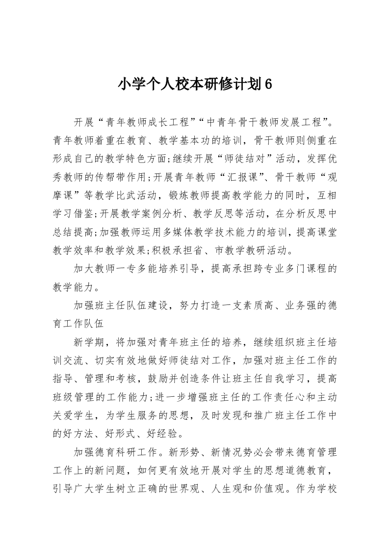 小学个人校本研修计划6开展“青年教师成长工程”“中青年骨干教师发展工程”。青年教师着重在教育、教学基本功的培训,骨干教师则侧重在形成自己的教学特色方面;继续开展“师徒结对”活动,发挥优秀教师的传帮带作用;开展青年教师“汇报课”、骨干教师“观摩课”等教学比武活动,锻炼教师提高教学能力的同时,互相学习借鉴;开展教学案例分析、教学反思等活动,在分析反思中总结提高;加强教师运用多媒体教学技术能力的培训,提高课堂教学效率和教学效果;积极承担省、市教学教研活动。加大教师一专多能培养引导,提高承担跨专业多门课程的教学能力。加强班主任队伍建设,努力打造一支素质高、业务强的德育工作队伍新学期,将加强对青年班主任的培养,继续组织班主任培训交流、切实有效地做好师徒结对工作,加强对班主任工作的指导、管理和考核,鼓励并创造条件让班主任自我学习,提高班级管理的工作能力;进一步增强班主任的工作责任心和主动关爱学生,为学生服务的思想,及时发现和推广班主任工作中的好方法、好形式、好经验。加强德育科研工作。新形势、新情况势必会带来德育管理工作上的新问题,如何更有效地开展对学生的思想道德教育,引导广大学生树立正确的世界观、人生观和价值观。作为学校