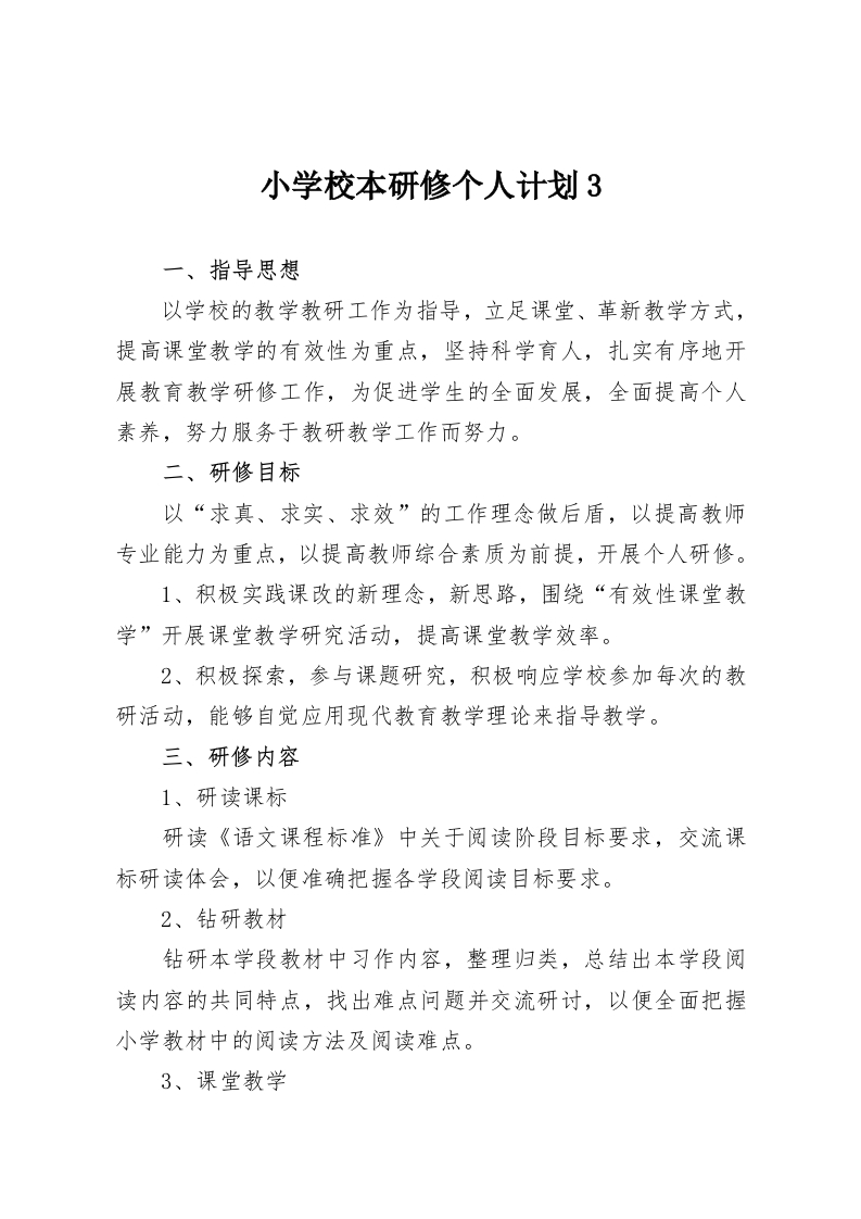小学校本研修个人计划3一、指导思想以学校的教学教研工作为指导,立足课堂、革新教学方式,提高课堂教学的有效性为重点,坚持科学育人,扎实有序地开展教育教学研修工作,为促进学生的全面发展,全面提高个人素养,努力服务于教研教学工作而努力。二、研修目标以“求真、求实、求效”的工作理念做后盾,以提高教师专业能力为重点,以提高教师综合素质为前提,开展个人研修。1、积极实践课改的新理念,新思路,围绕“有效性课堂教学”开展课堂教学研究活动,提高课堂教学效率。2、积极探索,参与课题研究,积极响应学校参加每次的教研活动,能够自觉应用现代教育教学理论来指导教学。三、研修内容1、研读课标研读《语文课程标准》中关于阅读阶段目标要求,交流课标研读体会,以便准确把握各学段阅读目标要求。2、钻研教材钻研本学段教材中习作内容,整理归类,总结出本学段阅读内容的共同特点,找出难点问题并交流研讨,以便全面把握小学教材中的阅读方法及阅读难点。3、课堂教学