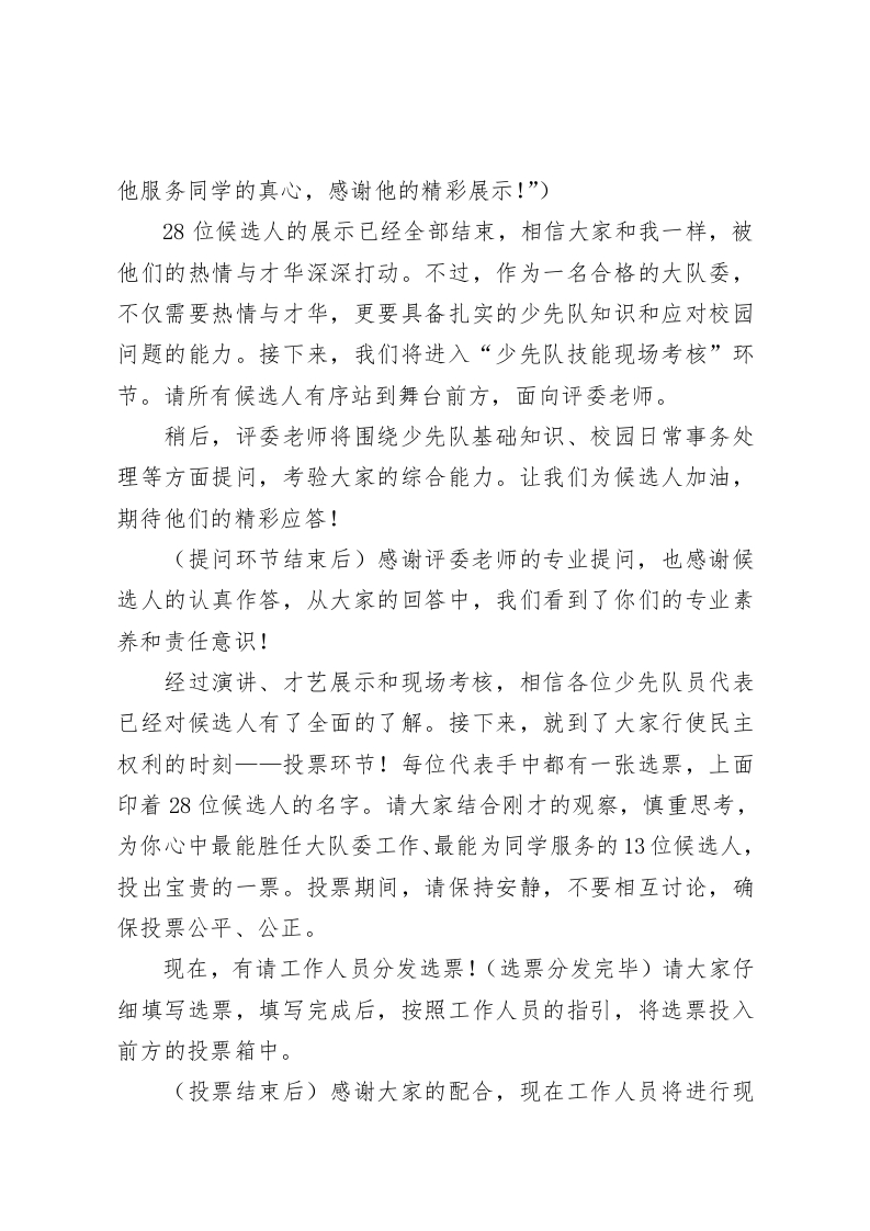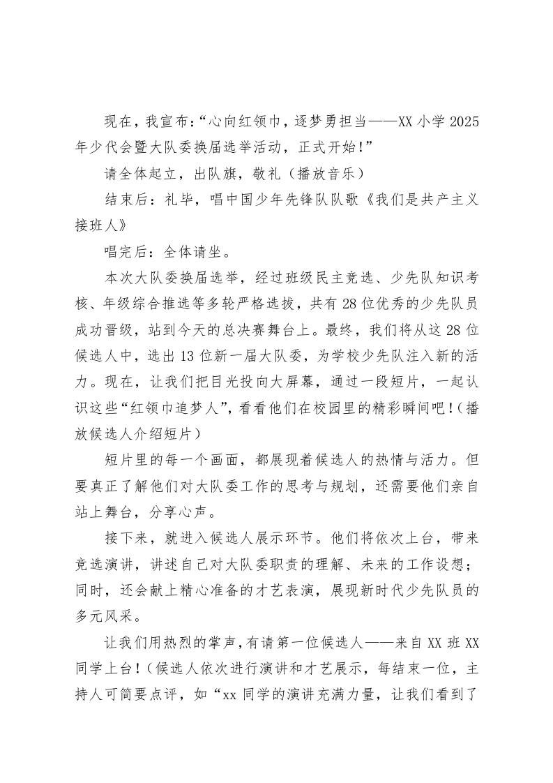 心向红领巾,逐梦勇担当Xx小学2025年少代会暨大队委换届选举活动主持稿亲爱的少先队员、敬爱的辅导员老师们、尊敬的校领导们:大家上午好!七十六载岁月流转,少先队的旗帜始终在前行路上高高飘扬,见证一代又一代少年从懵懂孩童成长为有理想、有担当的时代新人;七十六载薪火相传,红领巾的光芒始终在胸前闪耀,照亮着我们追逐梦想、践行责任的每一步征程。今天,我们以“心向红领巾,逐梦勇担当”为主题,举办XX小学2025年少代会暨大队委换届选举活动。这不仅是学校少先队组织建设的重要时刻,更是每一位少先队员展现自我风采、践行责任担当的闪亮舞台。“星星火炬,照亮前路”,作为新时代的少先队员,我们要接过前辈手中的接力棒,把对红领巾的热爱、对祖国的赤诚,融入日常的一言一行,让胸前的红领巾成为我们逐梦路上最鲜明的标志,让心中的责任感成为我们不断前行的强大动力!首先,请允许我代表学校少先队,向一直以来关心、支持少先队工作的各位校领导、辅导员老师们,致以最衷心的感谢和最崇高的敬意!也向今天到场的每一位少先队员代表,道一声:“欢迎你们,未来的小主人!”