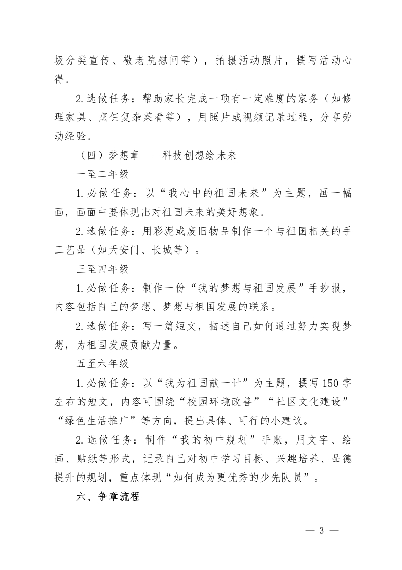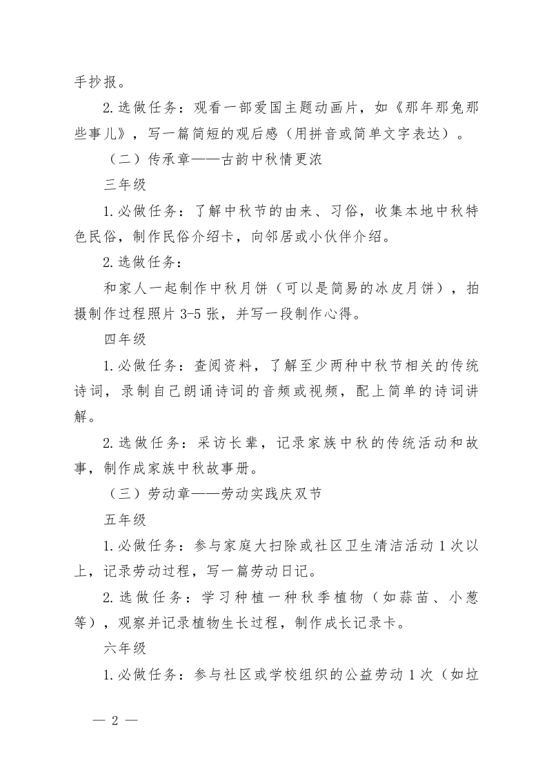 星星火炬伴成长,荣耀争章筑梦想2025年庆国庆迎中秋德育实践作业暨红领巾争章活动方案一、活动背景中秋佳节,月圆人聚,承载着深厚的中华传统文化;国庆盛典,举国同庆,彰显着国家的繁荣昌盛。值此双节同至之际,为弘扬爱国主义精神,传承中华优秀传统文化,培养学生的综合素养,增强少先队员的光荣感和责任感,特开展此次德育实践作业暨红领巾争章活动。二、活动主题三、活动时间9月22日-10月13日四、活动对象全体少先队员五、活动内容(一)向阳章一一红心向党迎国庆一年级1.必做任务:在家长陪同下,与国旗、国徽合影,拍摄照片,可以在照片上简单标注拍照地点和感受。2.选做任务:学唱一首爱国儿歌,如《国旗国旗真美丽》,录制演唱视频分享到班级群。二年级1.必做任务:收集2-3个爱国小故事,制作成图文并茂的一1