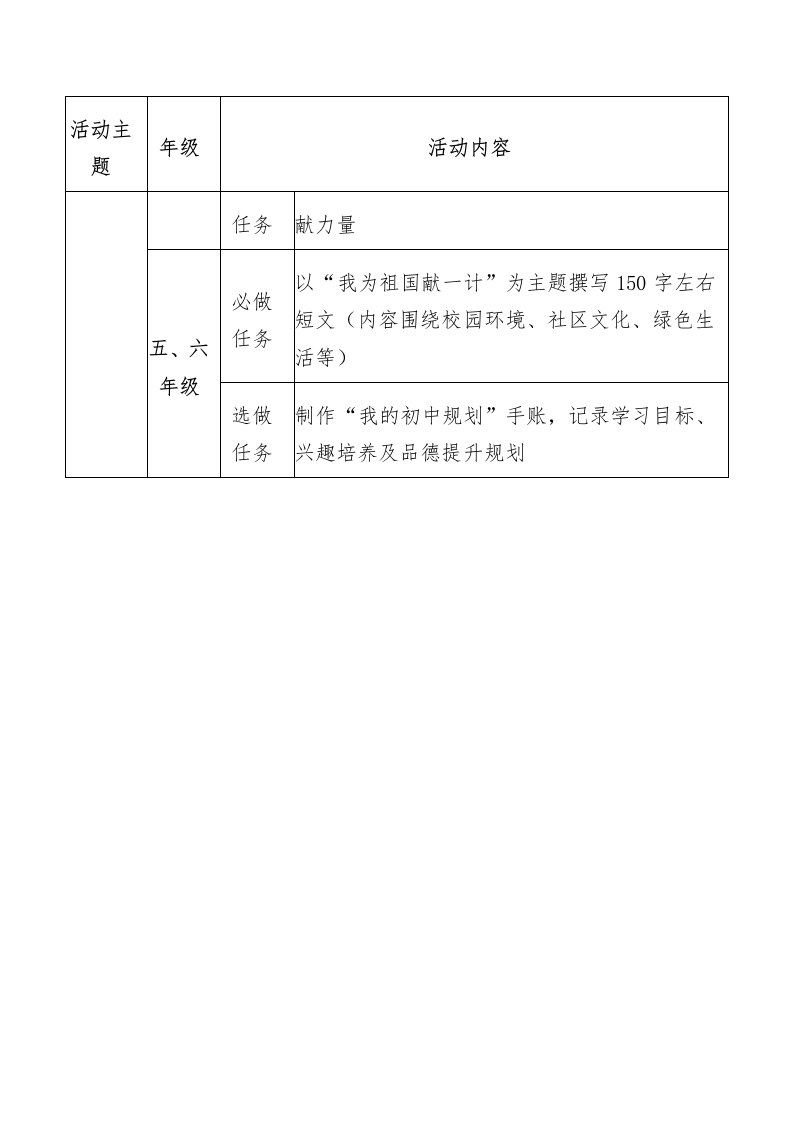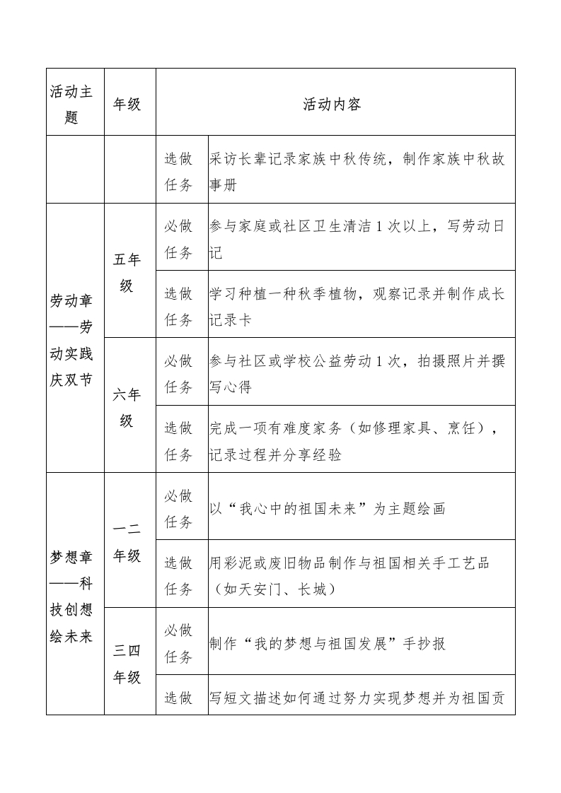 星星火炬伴成长,荣耀争章筑梦想2025年庆国庆迎中秋红领巾争章活动安排活动主年级活动内容题必做与国旗、国徽合影,拍摄照片并标注地点和感一年任务受级向阳章选做学唱一首爱国儿歌(如《国旗国旗真美丽》),红任务录制视频分享心向党必做迎国庆收集2-3个爱国小故事,制作图文手抄报二年任务级选做观看爱国主题动画片(如《那年那兔那些事任务儿》),写简短观后感必做了解中秋节由来习俗,制作本地民俗介绍卡并传承章三年任务向他人介绍古级选做与家人制作月饼,拍摄过程照片并写制作心得韵中秋任务情更浓四年必做了解并朗诵至少两首中秋相关诗词,录制音频级任务或视频并配讲解