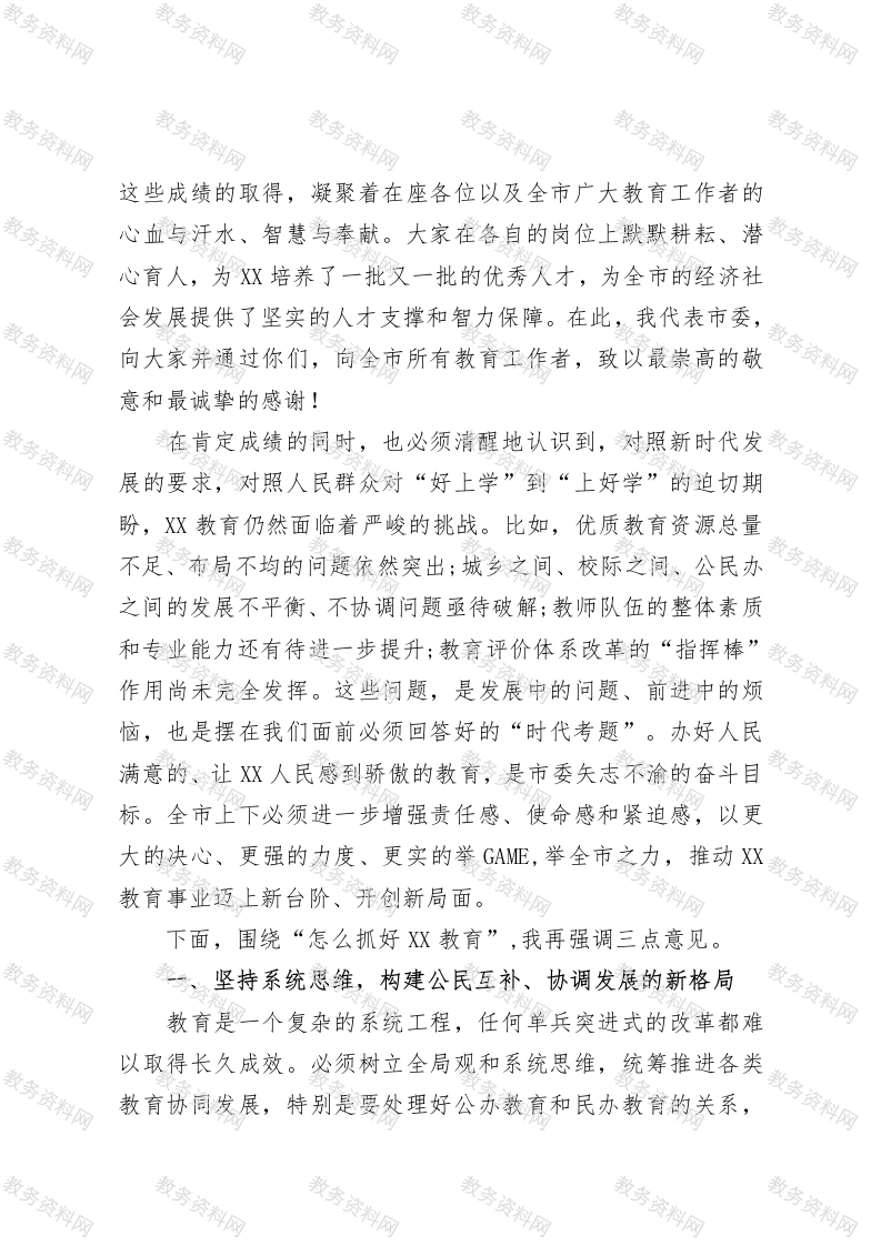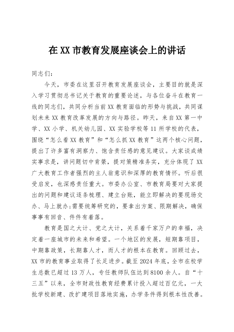 在XX市教育发展座谈会上的讲话同志们:今天,市委在这里召开教育发展座谈会,主要目的就是深入学习贯彻总书记关于教育的重要论述,与各位奋斗在教育一线的同志们,共同分析当前XX教育面临的形势与挑战,共同谋划未来Xx教育改革发展的方向与路径。昨天,来自XX第一中学、XX小学、机关幼儿园、XX实验学校等11所学校的代表,围绕“怎么看XX教育”和“怎么抓XX教育”这两个核心问题,提出了许多富有洞察力、饱含责任感的意见建议。大家谈成绩实事求是,讲问题切中肯綮,提对策精准务实,充分体现了XX广大教育工作者强烈的主人翁意识和深厚的教育情怀。听后很受启发,也深感责任重大。市委办公室、市教育局要对大家提出的问题和建议逐条梳理、建立台账,能立即解决的要现场交办、马上就办;需要统筹研究的,要拿出方案、限期解决,确保事事有回音、件件有着落。教育是国之大计、党之大计,关系着千家万户的幸福,决定着一座城市的未来和希望。一个地区的发展,短期靠项目,中期靠政策,长期靠人才,而人才的根本在教育。回顾过去,XX市的教育事业取得了长足进步。截至2024年底,全市在校学生总数已超过13万人,专任教师队伍达到8100余人。自“十三五”以来,全市财政性教育经费累计投入超过百亿元,一大批学校新建、改扩建项目落地实施,办学条件得到根本性改善。